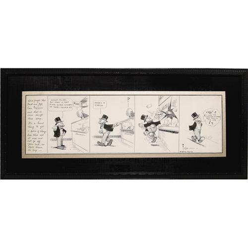 <B>Bud Fisher - Mutt and Jeff Daily Comic Strip Original Art (Star Co., 1914).</B></I> Mutt and Jeff's long-running title was beloved by the American public because of fun gags like this one. Honoring a request from an eight-year-old boy, Bud Fisher bestows easy money on Mutt and Jeff. Flushed with his new wealth, Jeff writes a check -- and then throws a brick through a $400 plate glass window! This daily has an image area that measures approximately 28" x 8", and the art is in Excellent condition. <I>From the Estate of Bruce Hamilton.</B></I> <BR><BR><B>Important notice:</B> Heritage usually auctions material at the rate of 200-250 lots per hour. On some occasions eBay Live bid software or the Internet may not be able to keep up with the pace of the auction. We recommend placing a realistic absentee bid now as insurance to avoid disappointment. Occasionally the auctioneer may eliminate or reject an eBay Live bid, and the auctioneer may also reopen a lot after the close of the eBay live bidding (usually because we missed an audience bid), and may reject your bid even if it shows you as the winning bidder. By bidding via eBay Live, you agree that Heritage may award the lot to another bidder at its sole discretion under the circumstances described above or any other reasonable circumstances. Since eBay bids are not shown to us until we open the lot on the floor, we treat those bids just like floor bids. In most cases the floor responds before the eBay bid is presented to us, due to Internet lag time, so for consistency we have made it a policy that floor bids are always considered first over tie eBay live bids. Also please note that all Heritage lots purchased through eBay Live carry a 22.5% Buyer's Premium. Please make sure you read the Terms and Conditions before you bid. This lot is being auctioned in conjunction with a live floor auction by Heritage Auction Galleries. All final auction and invoice information will be supplied by Heritage Auction Galleries, and all other information should be considered preliminary. Lot:41001 <BR><BR><B>Winning Notification and Billing:</B> After the FINAL session in this auction is complete, Heritage will send e-mail and snail mail invoices. This process normally takes several days. All final auction and invoice information will be supplied by Heritage Auction Galleries, and all other information should be considered preliminary. <BR><BR>This auction will be conducted on a live auction floor and over the Internet through eBay Live. If you choose to place an absentee bid, please take a moment to <font color='#0000ff'><u><a href='http://pages.ebay.com/liveauctions/help/before/laabsentee.html'>learn how eBay Live absentee bidding works</a></u></font><font color='#000000'>