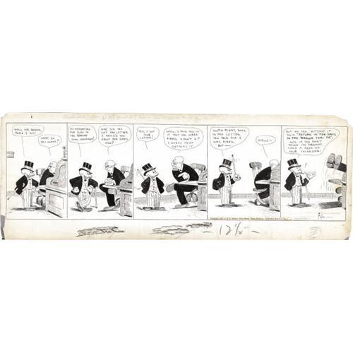 <B>Bud Fisher - Mutt and Jeff Daily Comic Strip Original Art, dated 2-27-26 (H. C. Fisher, 1926).</B></I> The unsinkable Jeff finds a loophole in his pink slip from the Brown Coal Company. This daily has an image area of 29" x 8.25". The art has some overall aging along the extreme edges, and pieces out of the corners of the paper (outside the image area), otherwise, it is in Good condition.