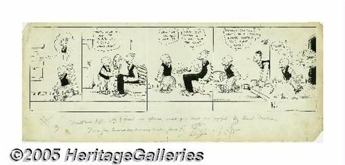 <B>Bud Fisher - Mutt and Jeff Daily Comic Strip Original Art, dated 7-1-22 (H. C. Fisher, 1922).</B></I> The original "odd couple," Mutt and Jeff, are at each other's throats once again, in this daily from 1922. With friends like these... who needs enemies? This entertaining (and painful) daily is chock full of the graphic symbols Fisher used to convey ideas, such as dotted sight-lines, hovering question marks, and of course, floating stars connoting pain. The overall art size of 30.5" x 12", with an image area of 29" x 8.5". The art has some overall aging and pin holes, outside of the image area, otherwise in Excellent condition.