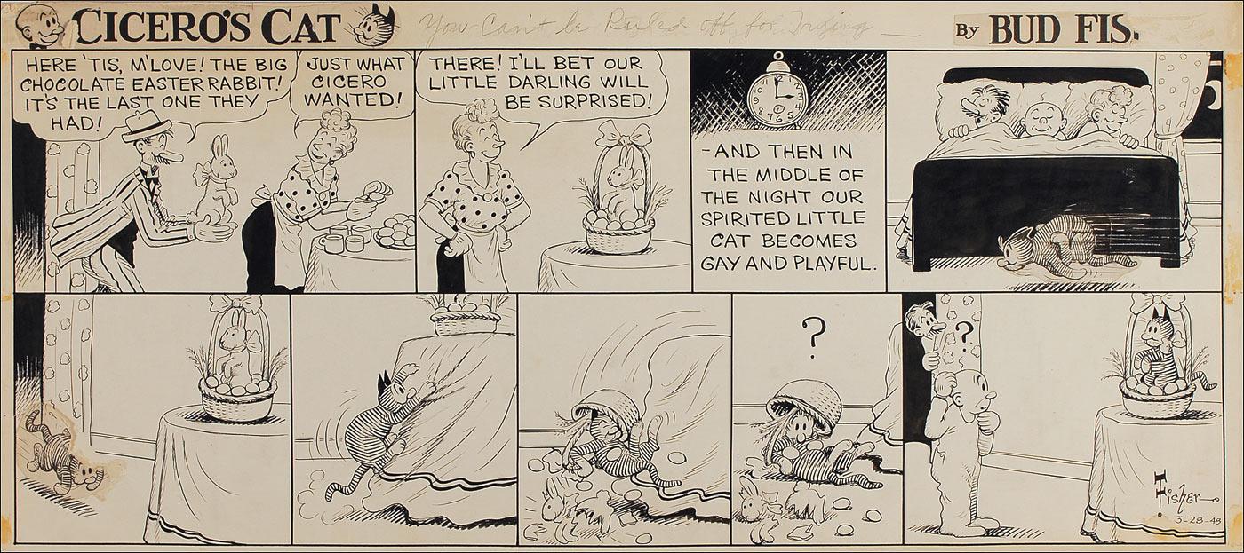 Original hand-inked nine-panel Cicero’s Cat daily comic strip, dated March 28, 1948 on an off-white 24.75 x 11 piece of artist’s cardstock. Strip depicts the title feline’s late night romp and unfortunate run-in with an Easter basket. Signed in black ink in the last panel, “Fisher.” Small tears to a paste-up, edge creasing, adhesive staining, light soiling, some editorial notations, and faint show-through from an adhesive label affixed to the reverse, otherwise fine condition.