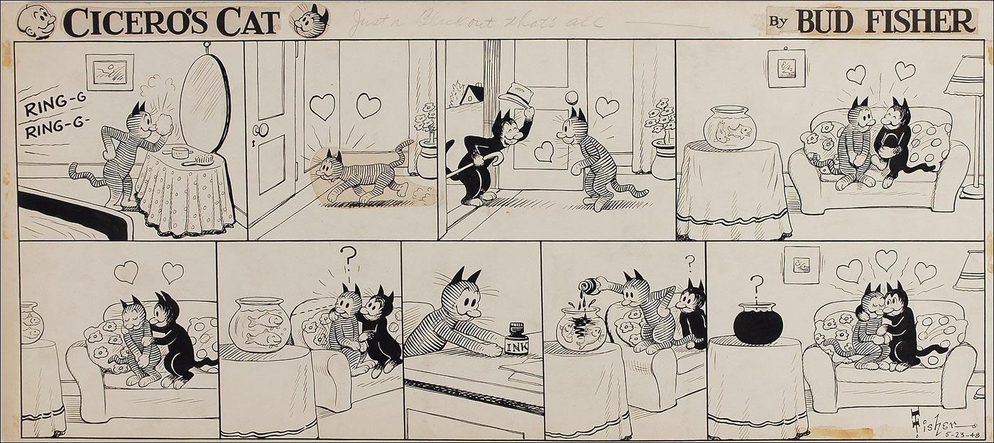 Original hand-inked nine-panel Cicero’s Cat daily comic strip, dated May 23, 1948 on an off-white 24.75 x 11 piece of artist’s cardstock. Strip depicts the title feline’s late night rendezvous with an amorous suitor and the prying eyes of two inquisitive fish. Signed in black ink in the last panel, “Fisher.” Areas of adhesive staining, light soiling, some editorial notations, and faint show-through from an adhesive label affixed to the reverse, otherwise fine condition.