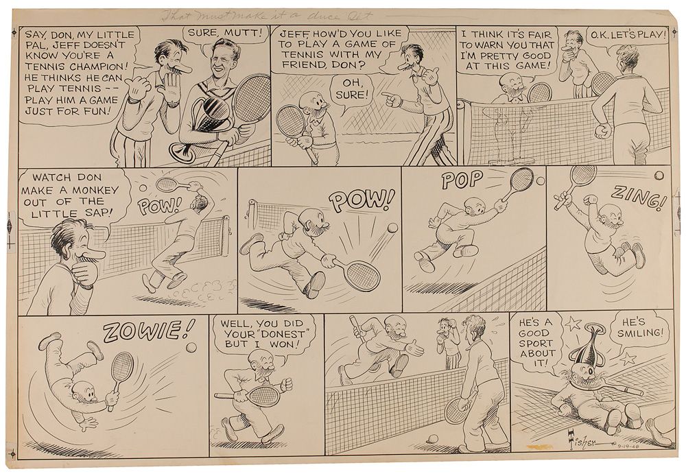 Original artwork for a Mutt and Jeff 11-panel comic strip entitled ‘That Must Make It a Duce Set,’ ink on artist’s cardstock, 25.25 x 17, September 19, 1948, signed in the final panel, “Fisher.” Features Jeff in a tennis match with tennis great Don Budge. Subtle scattered soiling and a small spot of adhesive residue to final panel, otherwise fine condition.