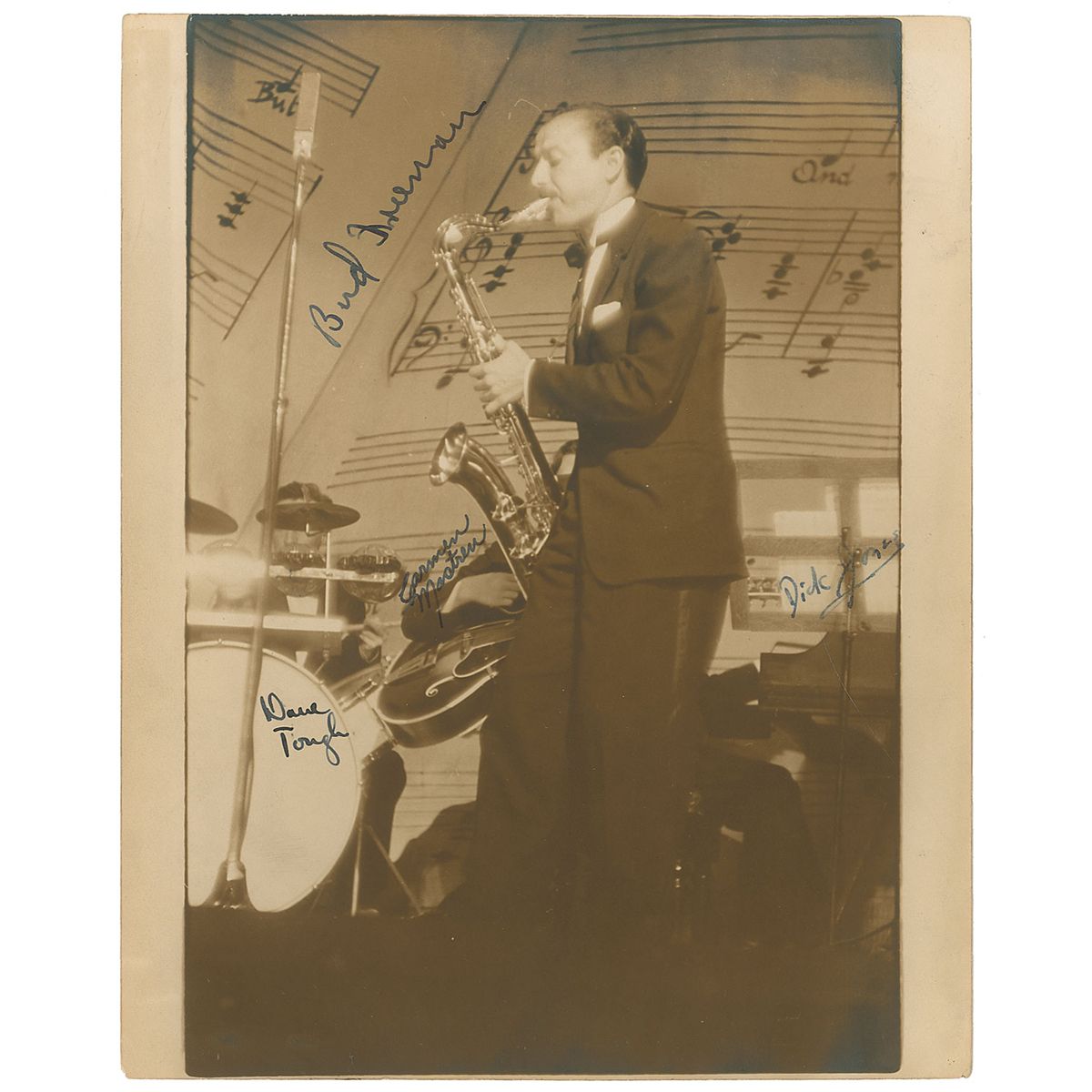 Vintage sepia 8 x 9.75 paperstock photo of Freeman and Tough on stage, signed in fountain pen by Bud Freeman, Dave Tough, Dick Jones, and Carmen Mastren. In fine condition, with a few scattered creases.