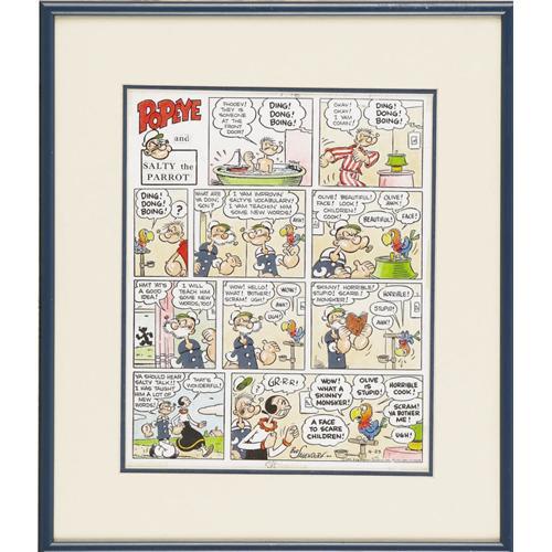 <B>Bud Sagendorf - Popeye Hand-Colored Sunday Comic Strip Print, dated 4-23-61 (King Features Syndicate, 1961).</B></I> Salty the parrot ruffles a little more than feathers, when Pappy teaches him a few new words, in this hand-colored copy of a Bud Sagendorf <I>Popeye</B></I> Sunday strip. Matted and framed, the image area measures 7" x 8.5". Some light glue staining in the first frame; otherwise the condition is Very Good. <BR><BR><B>Important notice:</B> Heritage usually auctions material at the rate of 200-250 lots per hour. On some occasions eBay Live bid software or the Internet may not be able to keep up with the pace of the auction. We recommend placing a realistic absentee bid now as insurance to avoid disappointment. Occasionally the auctioneer may eliminate or reject an eBay Live bid, and the auctioneer may also reopen a lot after the close of the eBay live bidding (usually because we missed an audience bid), and may reject your bid even if it shows you as the winning bidder. By bidding via eBay Live, you agree that Heritage may award the lot to another bidder at its sole discretion under the circumstances described above or any other reasonable circumstances. Since eBay bids are not shown to us until we open the lot on the floor, we treat those bids just like floor bids. In most cases the floor responds before the eBay bid is presented to us, due to Internet lag time, so for consistency we have made it a policy that floor bids are always considered first over tie eBay live bids. Also please note that all Heritage lots purchased through eBay Live carry a 22.5% Buyer's Premium. Please make sure you read the Terms and Conditions before you bid. This lot is being auctioned in conjunction with a live floor auction by Heritage Auction Galleries. All final auction and invoice information will be supplied by Heritage Auction Galleries, and all other information should be considered preliminary. Lot:41001 <BR><BR><B>Winning Notification and Billing:</B> After the FINAL session in this auction is complete, Heritage will send e-mail and snail mail invoices. This process normally takes several days. All final auction and invoice information will be supplied by Heritage Auction Galleries, and all other information should be considered preliminary. <BR><BR>This auction will be conducted on a live auction floor and over the Internet through eBay Live. If you choose to place an absentee bid, please take a moment to <font color='#0000ff'><u><a href='http://pages.ebay.com/liveauctions/help/before/laabsentee.html'>learn how eBay Live absentee bidding works</a></u></font><font color='#000000'>