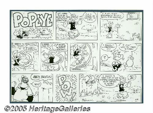 <B>Bud Sagendorf - Popeye Sunday Comic Strip Original Art, dated 12-8-74 (King Features Syndicate, 1974).</B></I> Hot dorg! It's a good day fer smackin' practice and all Popeye needs is sumpin' to hit! Lucky thing Brutus comes along! At the time this Sunday strip was completed, Forrest "Bud" Sagendorf was holding the reins of the <I>Popeye</B></I> comic strip, as he had since 1958. The art measures 21" x 14" and even with a few blue line editorial markings, this work is in Excellent condition.