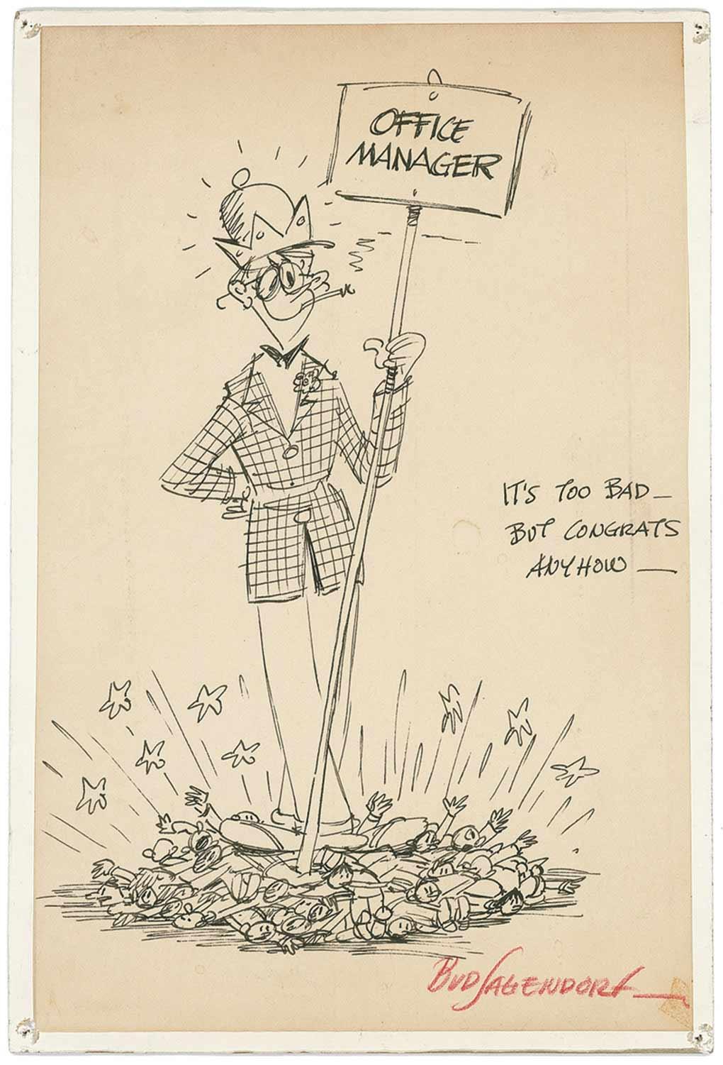 Amusing original ink sketch celebrating a friend or colleague’s promotion to office manager, on an off-white 8.75 x 13.75 sheet affixed to a slightly larger card, signed in red crayon at lower right, “Bud Sagendorf.” A hint of mild toning, a few surface marks, and small glue stain just touching dash after name, otherwise fine condition.