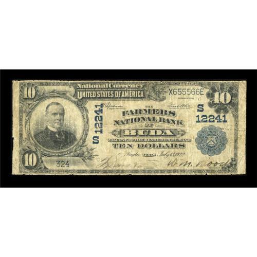<B>Buda, TX</B></I> - $10 1902 Plain Back Fr. 635 <B>The Farmers NB</B></I> Ch. # (S)12241<BR> Kelly indicated two notes are known from this Hays County issuer which operated from 1922 to 1927. As the only bank in town, the notes likely circulated much longer than the average national, thus greatly diminishing their survival rate. The only example to make it to auction sold for $2,090 back in 1996. The evenly circulated paper shows some minor breaks and pinholes. <B>Good.</B></I><BR><BR><b>Shipping:</b> Coins & Currency (<a target="_blank" href="http://www.heritageauctions.com/common/shipping.php">view shipping information</a>)