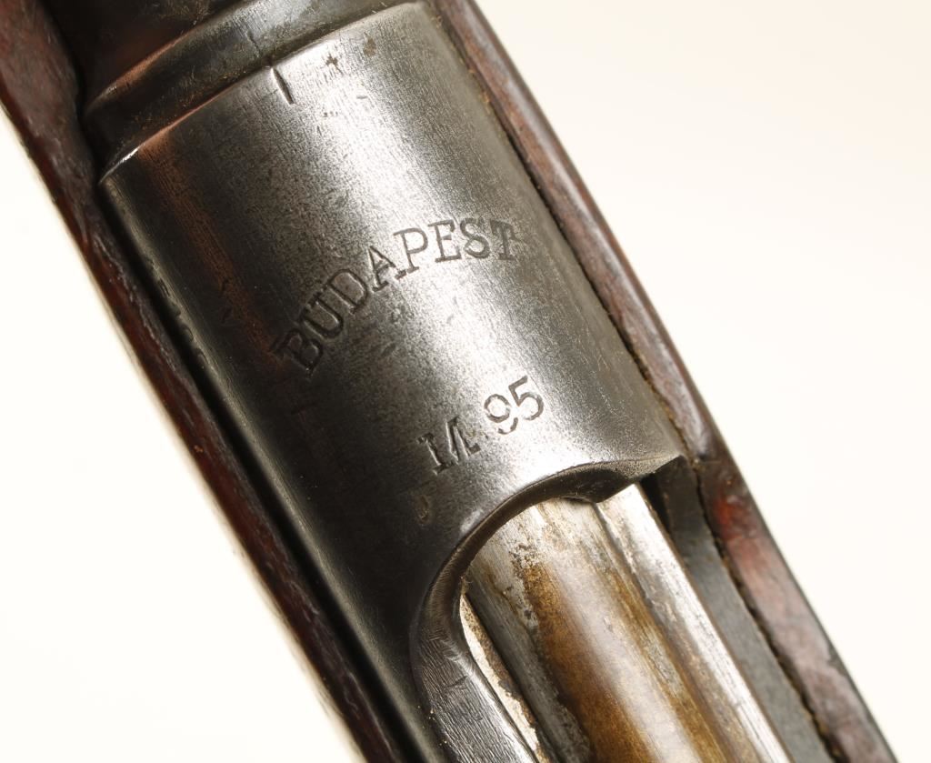 Hungarian blued military straight-pull bolt-action rifle with a 19-3/4" barrel. Import marked. Bluing is worn on exposed areas and edges leaving some pin-prick pitting and surface rust. Rear barrel band is missing its retaining screw. Wood has dings and dents and a filled area from a sling swivel on the belly of the butt stock. it also has the numbers "4510" and 7936" with the initial "M" scratched in. Bore is frosty with good rifling. Action works well. Condition is poor to fair. *Modern Firearm*