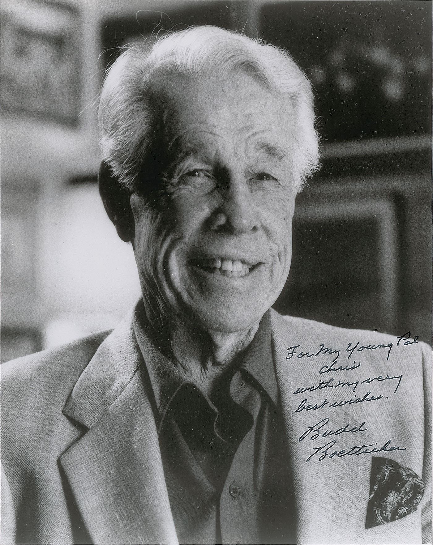 American film director (1916–2001) during the classical period in Hollywood, most famous for the series of low-budget Westerns he made in the late 1950s starring Randolph Scott. Glossy 8 x 10 photo of the acclaimed director, signed and inscribed in black felt tip, "For my young pal Chris, with my very best wishes, Budd Boetticher.” In fine condition. Boetticher is rare in any format, with this being the first signed picture we have ever offered.
