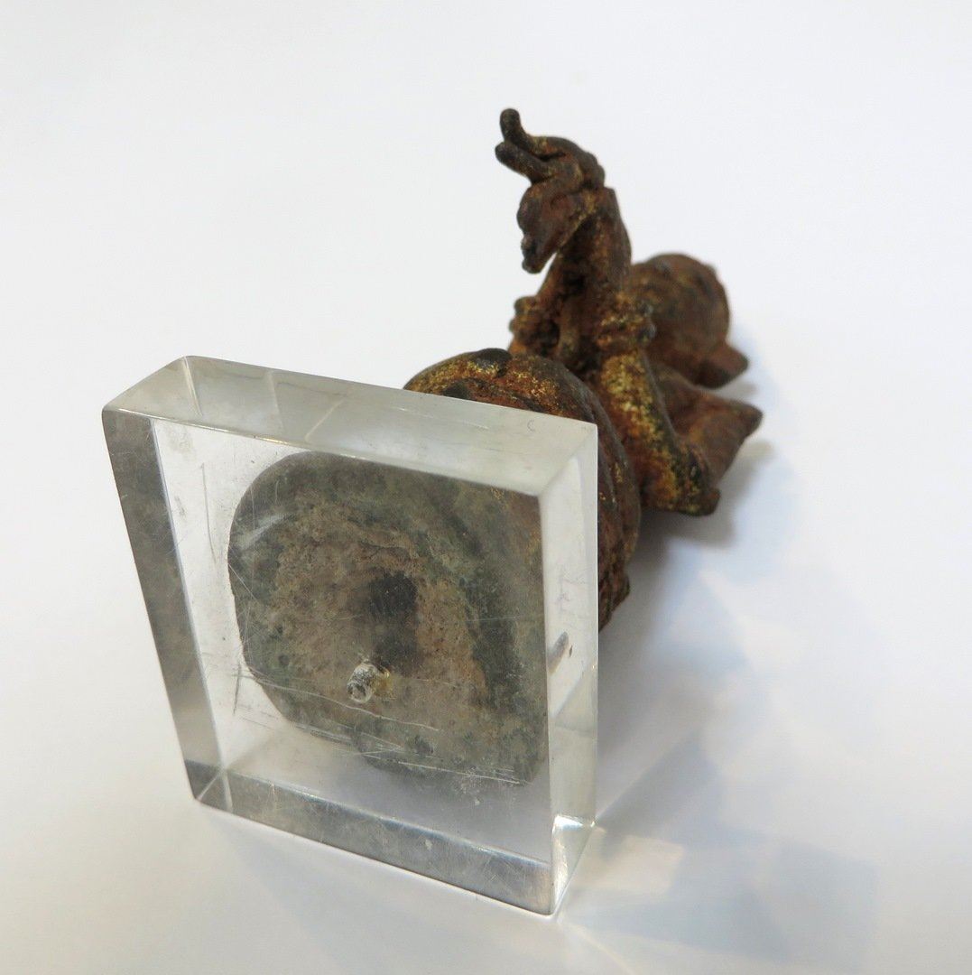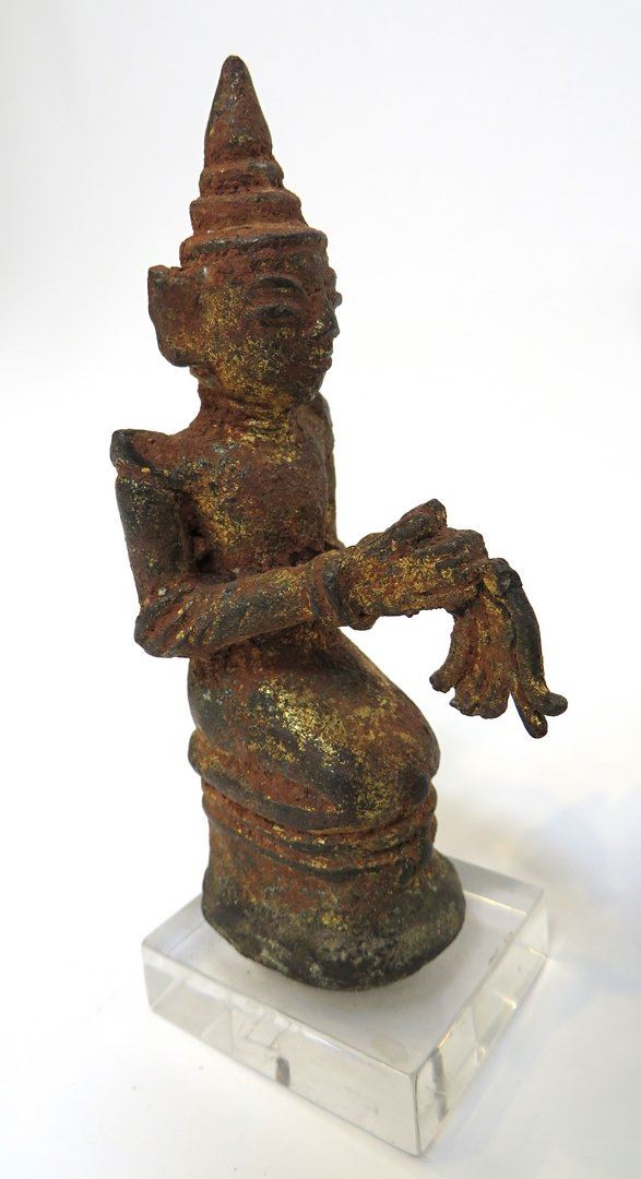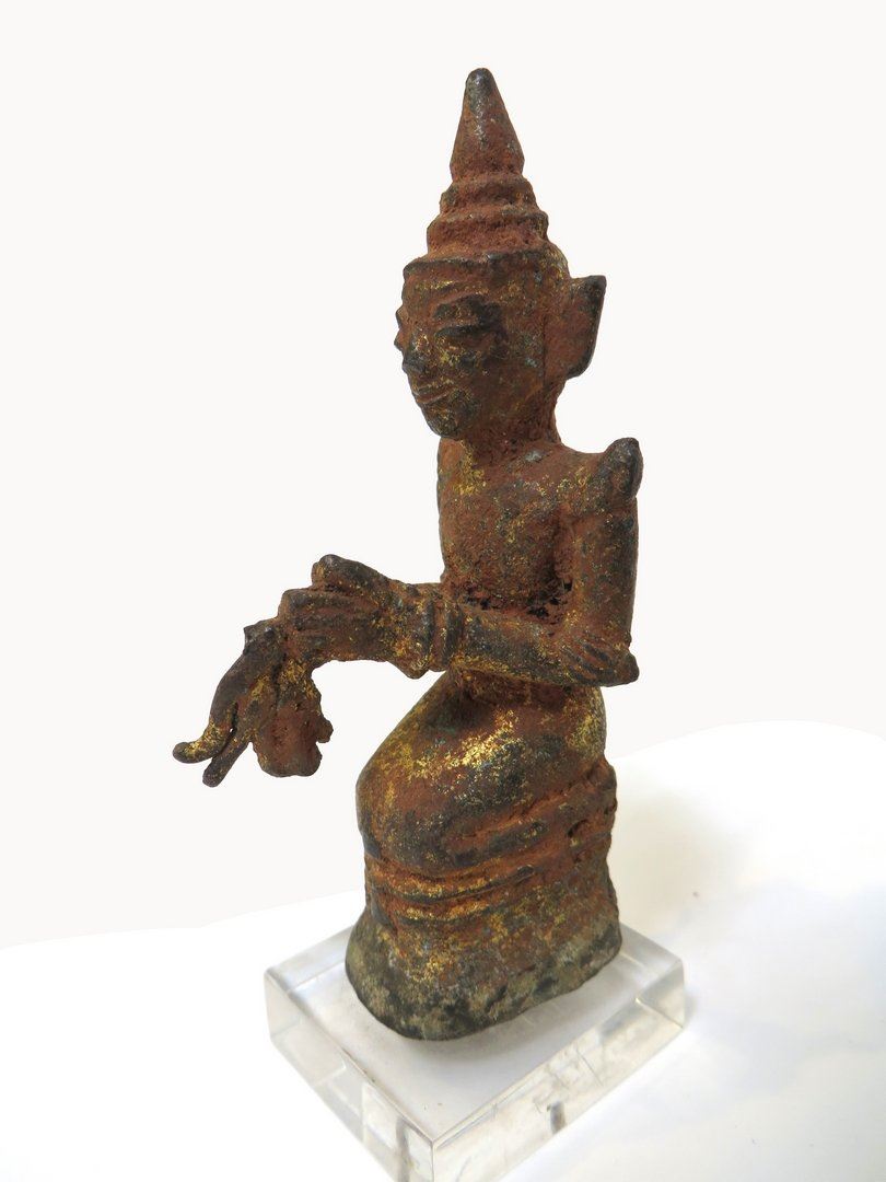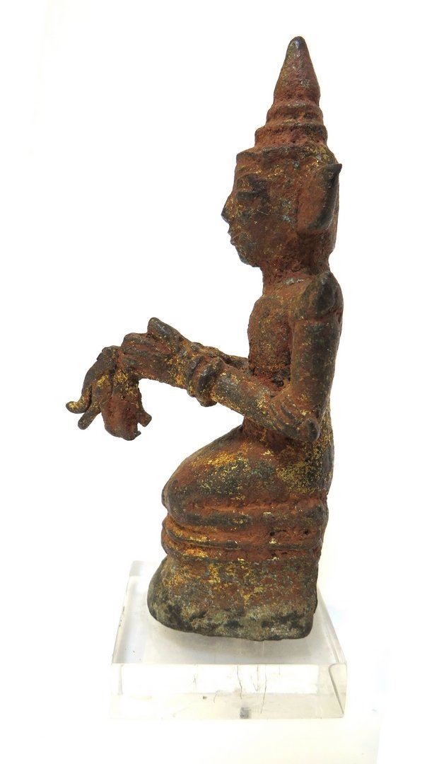 Buddha casting in the prayer position on a clear stand. Shows signs of wear consistent with age.