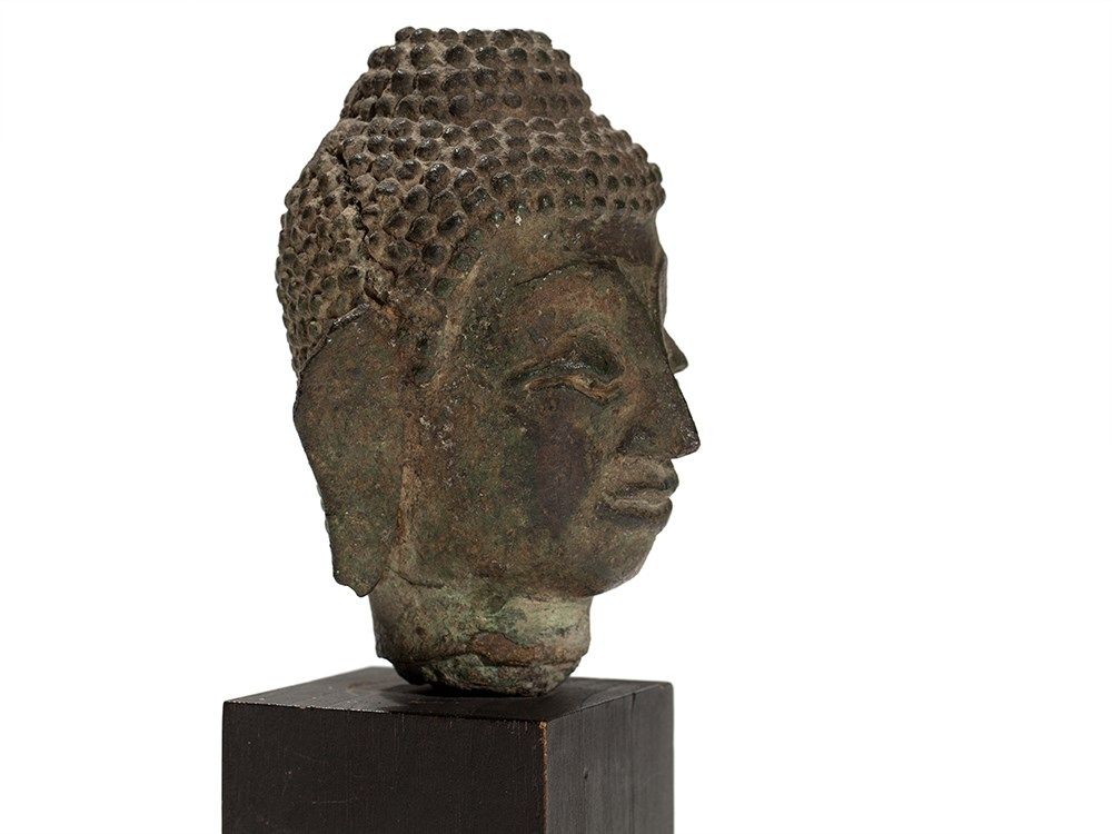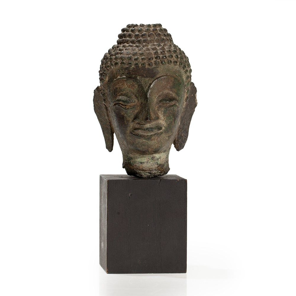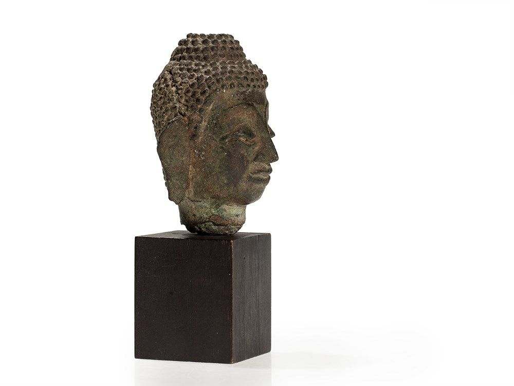 This Buddha head was made Burma (Myanmar) in the 17th century and is characterized by its distinct malachite patina. The face of the enlightened has an aristocratic expression with half-closed eyes. The bridge of the nose passes into finely curved eye brows. The full lips of the mouth are formed into a slight smile and give the face a peaceful, meditative expression. Long earlobes, the dome-shaped ushnisha and the little curls on Buddhas head underline his majesty. The head is mounted on a modern wooden base.