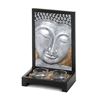 Buddha Plaque Candle Decor **|**|** Creating a space thats equal parts calming and gorgeous is easy with this beautiful candle holder. The wood frame holds two clear glass tealight candle cups surrounded by polished stones, and the standing plaque features an artistic Buddha face finished in gleaming silver.Description Details Item weight: 1.8 lbs.Product Dimensions: 6-1/4 x 4-1/8" x 9-1/2" high; each candle holder is 2" diameter x 1" high.Product Material: MDF wood, resin, stones and glass.UPC Code: 849179019792.Packaging: 1 SET"