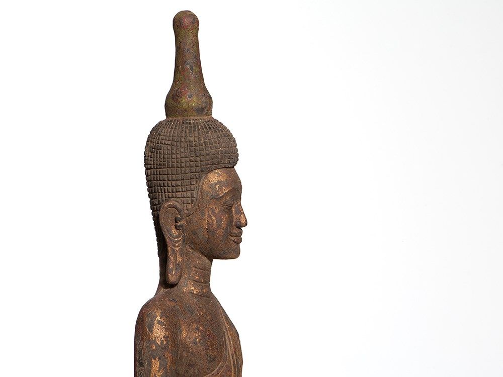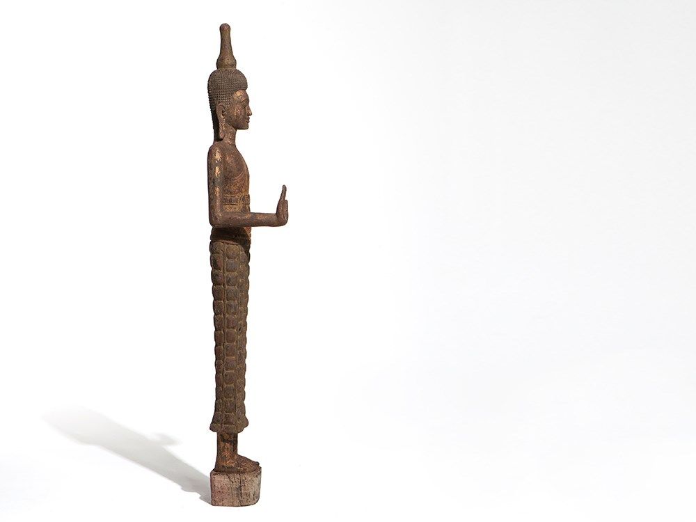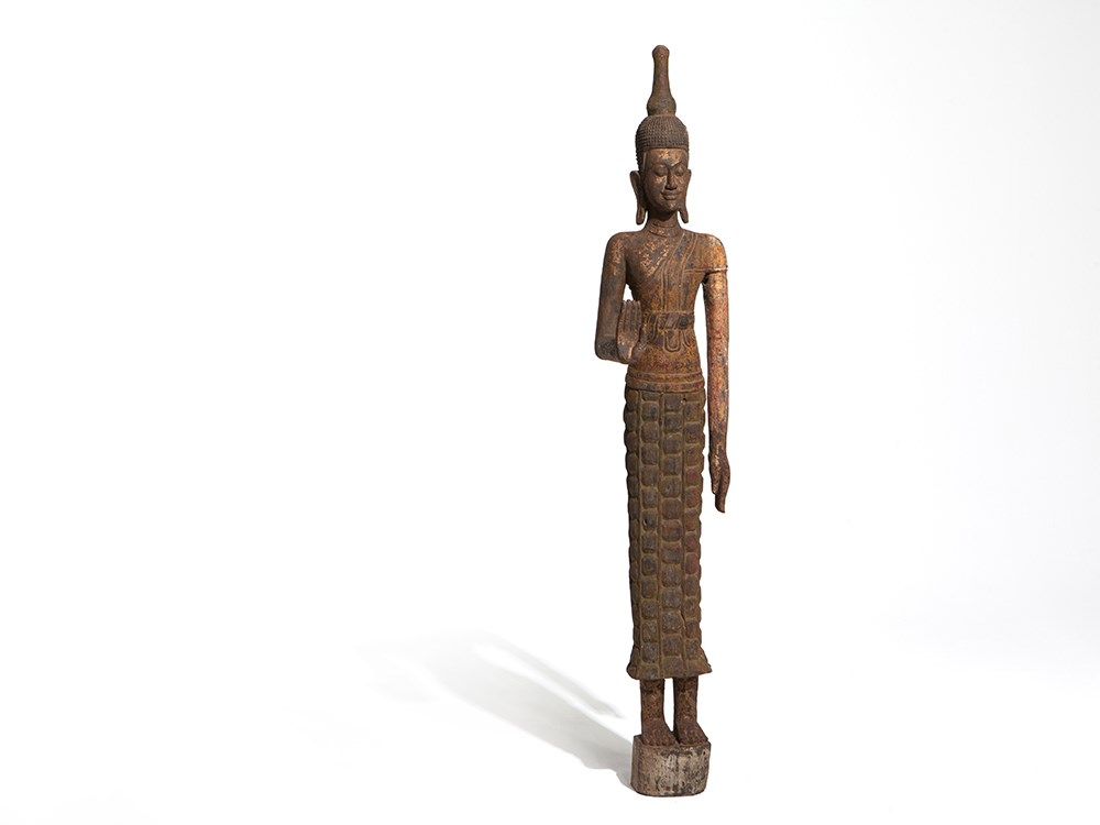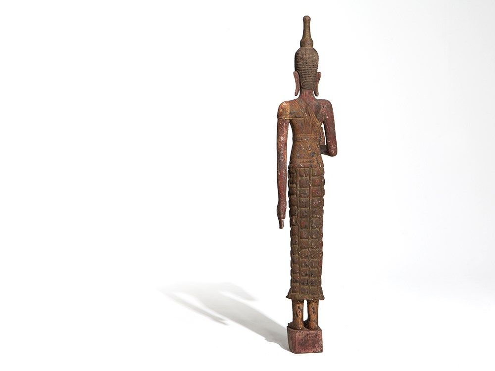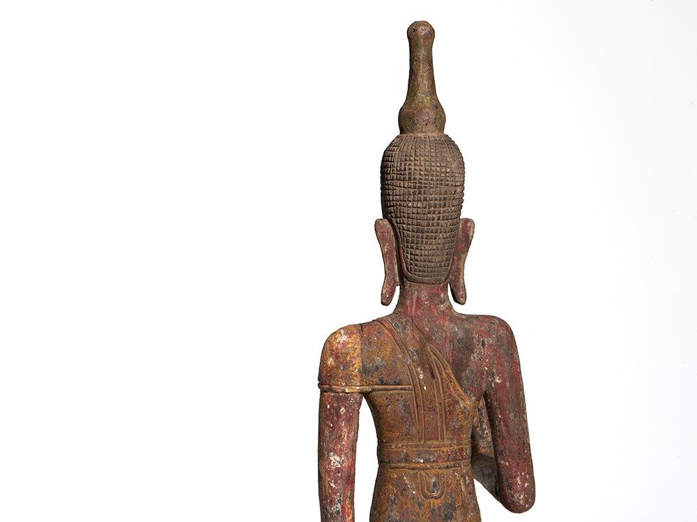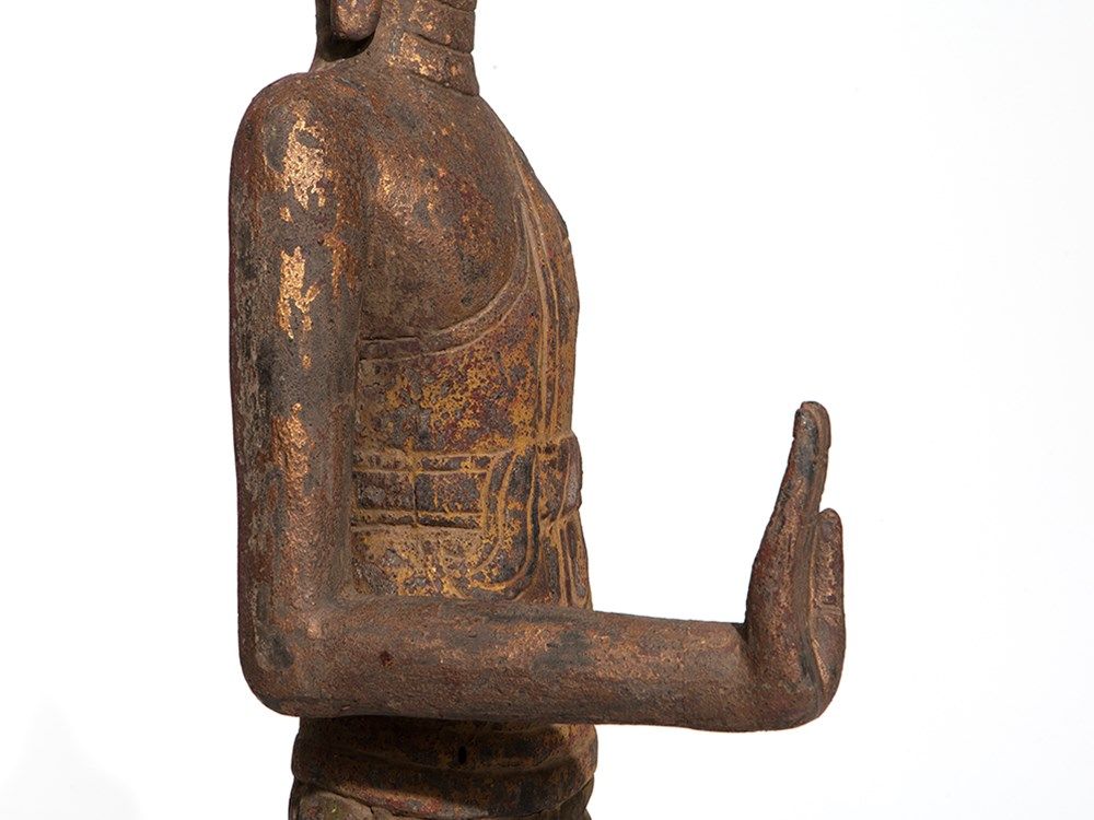 This large Buddha figure is made of wood and dates to the 19th Century Thailand. Buddha is displayed in the upright samabhanga stand on a round base. His right hand is raised to his chest and forms the abhaya mudra with palm turned forward. This is the gesture of fearlessness and granting protection. The fingers of the left hand are pointing towards the ground. Buddha is wearing a long carved robe in relief that is wrapped around his left shoulder. He has a peaceful, meditative expression, long ear lobes and deep neck folds. Buddha’s head is crowned by a high ketumala. Due to the remaining traces of gilding and pigment a graceful aesthetic is created.