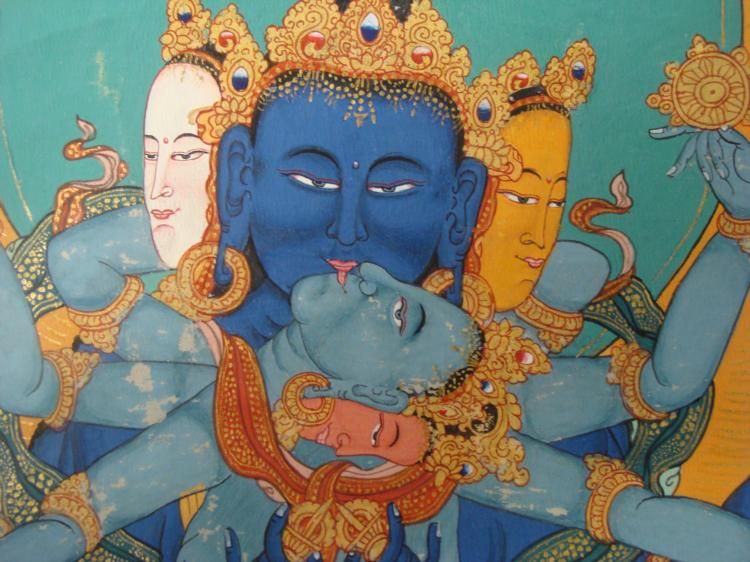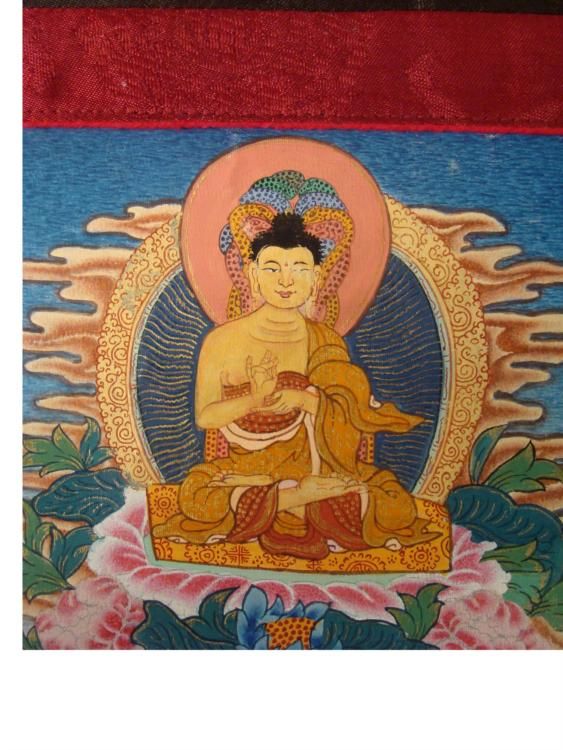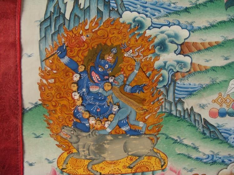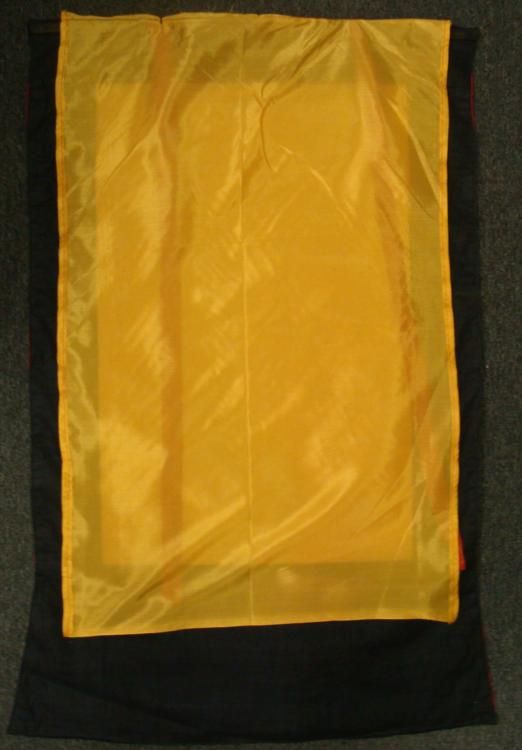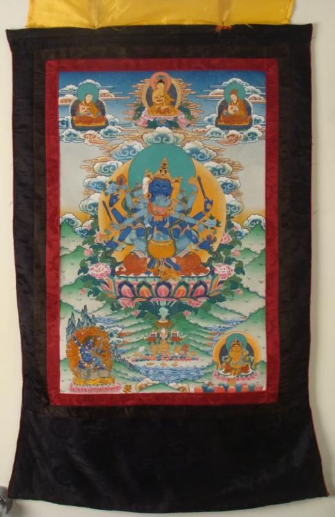 This is a silk screen scroll tapestry with both Buddhist & Hindu imagery. The size is 24 x 39 3/4 inches, and it hangs from a wooden stick. This very colorful tapestry is also considered lucky. At the center is Shiva with arms out, surrounded by Goddesses, all a symbol of love, wealth, and power. The more arms Shiva has, the more that can be loved, embraced, and gained. Above sits Buddha in a sitting position with 2 other figures, one on each side. The soft colors are beautiful, with elegant details. It is bordered in red and black patterned silk, and draped in yellow on back. * This will make an attractive covering for your wall.