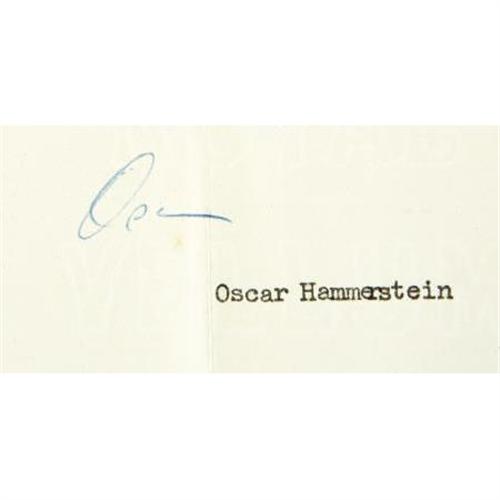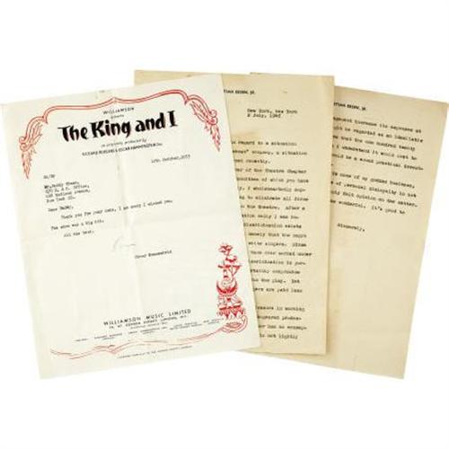 <B>Buddy Ebsen Correspondence with Oscar Hammerstein.</B></I> The lot contains a fascinating two-page unsigned letter from Buddy Ebsen, dated July 2, 1946, addressed to Oscar Hammerstein II and typed on his personal stationery with his full name "Christian Ebsen Jr." on the letterhead. Buddy was appearing at the Ziegfeld Theatre in a hit revival of <I>Show Boat,</B></I> produced by Jerome Kern (who wrote the music) and Oscar Hammerstein II (who wrote the book and lyrics). Buddy's letter to Hammerstein protests that "the negro singers are paid less than the white singers...You may feel that this is none of my goddamn business, but I would feel a sense of personal disloyalty in not expressing to you my deeply felt opinion on the matter..." There is no indication of Hammerstein's response. The lot does include a letter from Hammerstein, signed "Oscar" in blue ink, dated October 12, 1953 and typed on very striking stationery created for <I>The King and I,</B></I> the smash Rodgers and Hammerstein musical, which had just opened in London. Hammerstein writes to Buddy, "Thank you for your note, I am sorry I missed you. The show was a big hit. All the best." There is a light stain on the middle area of Buddy's letter and some toning on both sheets; the Hammerstein letter has some minor staining in its vertical crease. In overall Fine to Very Fine condition. The lot is especially significant for Ebsen's idealism, and the ornate stationery on which Hammerstein has penned his first name. <I>From the Buddy Ebsen Estate.</B></I><BR><BR><b>Shipping:</b> Flat Material, Small (<a target="_blank" href="http://www.heritageauctions.com/common/shipping.php">view shipping information</a>)