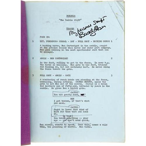<B>Buddy Ebsen Script from</B></I> <B><I>Bonanza.</B></I></B></I> Final Draft script, dated October 11, 1971, for the <I>Bonanza</B></I> episode "The Saddle-Stiff." Buddy has written "My personal script Buddy Ebsen" in black ink on the first page. An amusing episode, in which guest star Buddy, as "Cactus Murphy," goads aging Ben Cartwright (Lorne Greene) into performing hard cowpoke labor. The script features Buddy's extensive annotations; he's also written "Hertz" and a phone number on the front cover, and a book title on the back cover. In Very Fine condition with some wear to the cover. <I>From the Buddy Ebsen Estate</B></I>.<BR><BR><b>Shipping:</b> Books & Catalogs (<a target="_blank" href="http://www.heritageauctions.com/common/shipping.php">view shipping information</a>)