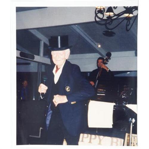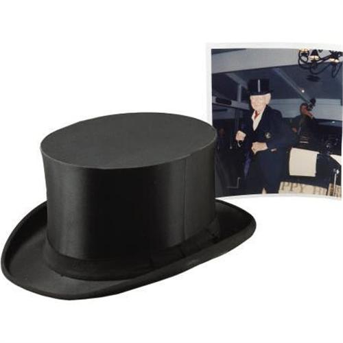 <B>Buddy Ebsen's Collapsible Top Hat Used for Live Show.</B></I> Every song and dance man needs a top hat and Buddy Ebsen was no exception - here's his collapsible black top hat, size seven and five-eighths, with a "Made in West Germany" tag inside the brim. It comes with a color 8" x 10" photo of a late-in-life Buddy sporting the hat and performing with microphone in hand. Hat and picture in Excellent condition. <I>From the Buddy Ebsen Estate.</B></I><BR><BR><b>Shipping:</b> Clothing, Costumes & Jerseys (<a target="_blank" href="http://www.heritageauctions.com/common/shipping.php">view shipping information</a>)