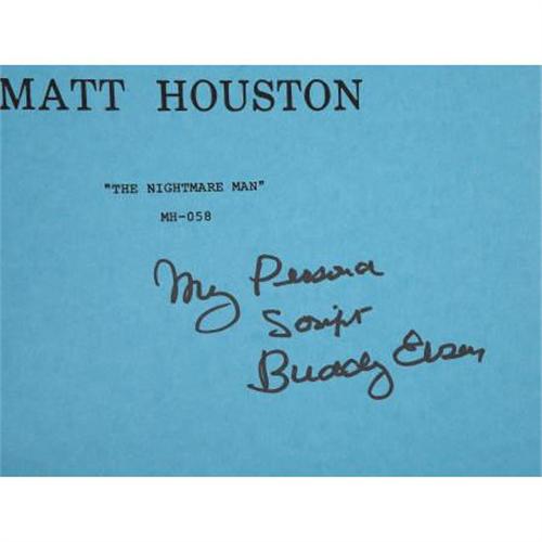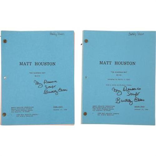 <B>Buddy Ebsen's First Two</B></I> <B><I>Matt Houston Scripts.</B></I></B></I> Ebsen had written "My personal script Buddy Ebsen" on the covers of these two scripts for the <I>Matt Houston</B></I> TV series, a second draft dated October 15, 1984 (with Buddy's annotations) and a final draft dated October 17, 1984. Ebsen played "Roy Houston," uncle of Matt (Lee Horsley) during the third and final season of the series. In Excellent condition. <I>Accompanied by a COA from PSA/DNA.</B></I> <I>From the Buddy Ebsen Estate.</B></I><BR><BR><b>Shipping:</b> Books & Catalogs (<a target="_blank" href="http://www.heritageauctions.com/common/shipping.php">view shipping information</a>)
