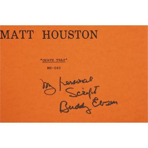 <B>Buddy Ebsen's Signed and Annotated</B></I> <B><I>Matt Houston</B></I></B></I> <B>Scripts for Episodes #62, 63, 66, 67, and 69.</B></I> Set of seven scripts from the early '80s detective series, each inscribed "My personal script Buddy Ebsen" by the actor in black felt tip, and many with his handwritten notations. Ebsen joined the series during its third and final season, appearing as the title character's uncle "Roy" in all but one episode of the season. Scripts include "Death Trap," "The Honeymoon Murders," "Company Secrets," "Killing Time" (two copies), and "Final Vows" (two copies), all in Very Fine to Excellent condition. <I>Accompanied by a COA from PSA/DNA.</B></I> <I>From the Buddy Ebsen Estate.</B></I><BR><BR><b>Shipping:</b> Books & Catalogs (<a target="_blank" href="http://www.heritageauctions.com/common/shipping.php">view shipping information</a>)