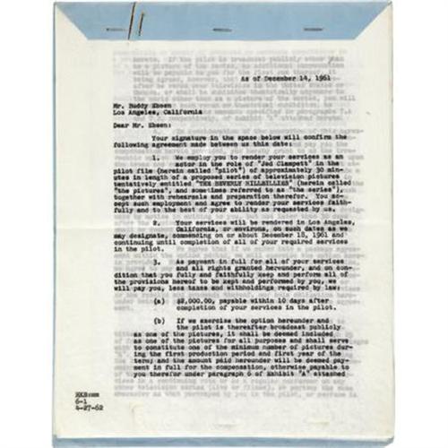 <B>Buddy Ebsen's Personal Unsigned Copy of his Original</B></I> <B><I>Beverly Hillbillies</B></I></B></I> <B>Contract.</B></I> Did Buddy Ebsen know he was about to strike a bonanza when he reviewed this December 14, 1961 Filmways TV Productions, Inc. contract that wooed him into the fold of <I>The Beverly Hillbillies</B></I>? Whatever his instincts, the details are all there: salary and various compensations, options and every angle a show business lawyer can foresee -- including "fire, epidemic, earthquake, flood, explosion or embargo..." The contract runs 17 pages with various addenda pages and comes in a Gang, Tyre, Rudin and Brown, Attorneys at Law legal folder. "Next thing ya' know, ol' Jed's a millionaire...!" In Excellent condition. <I>From the Buddy Ebsen Estate</B></I>.<BR><BR><b>Shipping:</b> Flat Material, Small (<a target="_blank" href="http://www.heritageauctions.com/common/shipping.php">view shipping information</a>)