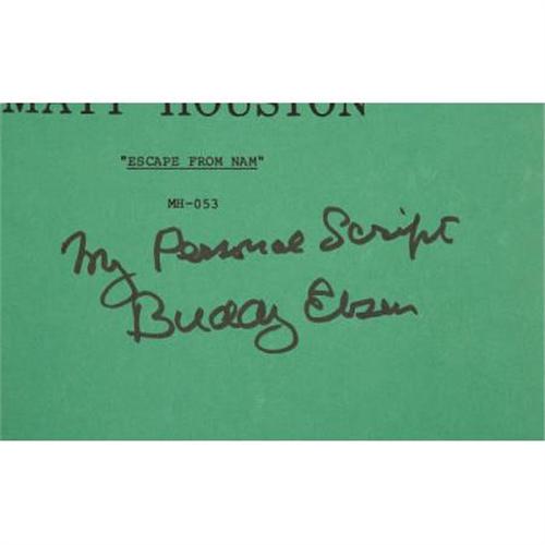 <B>Buddy Ebsen's Signed and Annotated</B></I> <B><I>Matt Houston</B></I></B></I> <B>Scripts for Episodes #54, 55, 58, 59, and 68.</B></I> The veteran actor, who joined the series for its third and final 1984/1985 season as Matt's "Uncle Roy," has signed the cover of each script "My Personal Script Buddy Ebsen." Episodes included are "Escape from Nam," "High Fashion Murders," "Deadly Games," "Stolen" (two drafts)," and "Death Watch" (two drafts, the earlier version titled "The Last Supper"), each containing his annotations. The script dates range from July 20, 1984 to October 2, 1984, and several have shooting schedule pages included. In Excellent condition. <I>Accompanied by a COA from PSA/DNA.</B></I> <I>From the Buddy Ebsen Estate</B></I>.<BR><BR><b>Shipping:</b> Books & Catalogs (<a target="_blank" href="http://www.heritageauctions.com/common/shipping.php">view shipping information</a>)