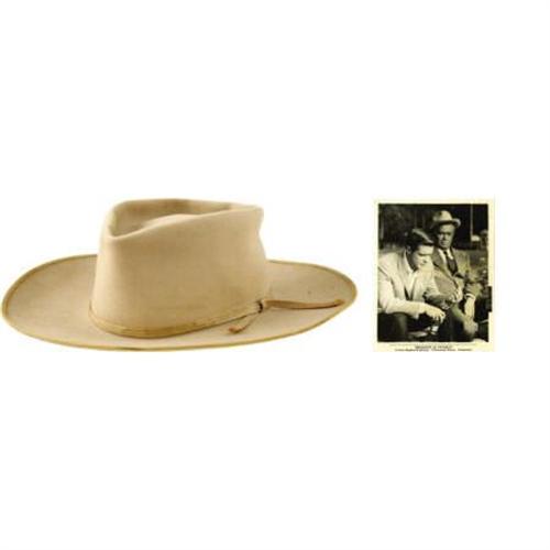<B>Buddy Ebsen's Stetson from</B></I> <B><I>Breakfast at Tiffany's.</B></I></B></I> Ranked by #61 on AFI's list of the Top 100 Romance Movies, <I>Breakfast at Tiffany's</B></I> has withstood the test of time as a classic of American cinema. The movie also gave Buddy Ebsen a career boost, with his small but effective role as "Doc Golightly" leading directly to his being cast as "Jed Clampett" on <I>The Beverly Hillbillies.</B></I> less than a year later. The rest, as they say, is history. This fine beaver Stetson was worn by Ebsen in each of his scenes in the movie; it is in Very Fine to Excellent condition with a few small areas of mild staining and discoloration, and has "Made by Stetson especially for Buddy Ebsen" embossed on the sweatband. Included with it are four b&w 8" x 10" stills from the movie featuring Ebsen wearing the hat, as well as a vintage copy of the soundtrack LP signed on the front cover by Ebsen in black felt tip (with some mild to moderate wear). A one-of-a-kind item from a classic film. <I>From the Buddy Ebsen Estate.</B></I><BR><BR><b>Shipping:</b> Clothing, Costumes & Jerseys (<a target="_blank" href="http://www.heritageauctions.com/common/shipping.php">view shipping information</a>)