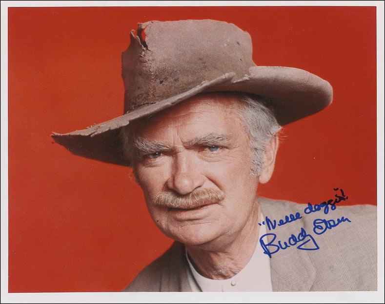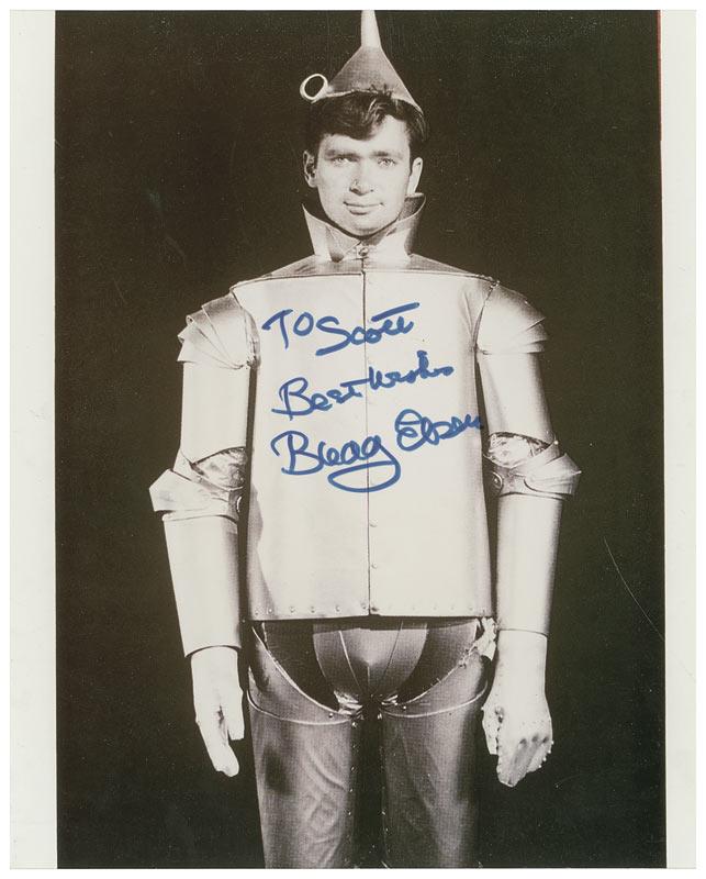 Two signed photos: a glossy 8 x 10 of Ebsen as the Tin Man from The Wizard of Oz, signed and inscribed in blue felt tip, “To Scott, best wishes, Buddy Ebsen”; and a color 10 x 8 of Jed Clampett, signed in blue felt tip, “Welll doggie! Buddy Ebsen.” In fine condition.