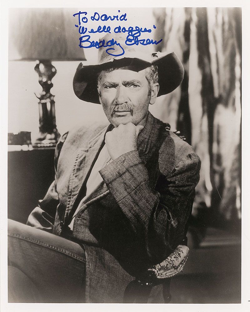 Glossy 8 x 10 photo of Ebsen as Jed Clampett, signed and inscribed in blue felt tip, “To David, ‘Welll doggie’ Buddy Ebsen.” In fine condition.