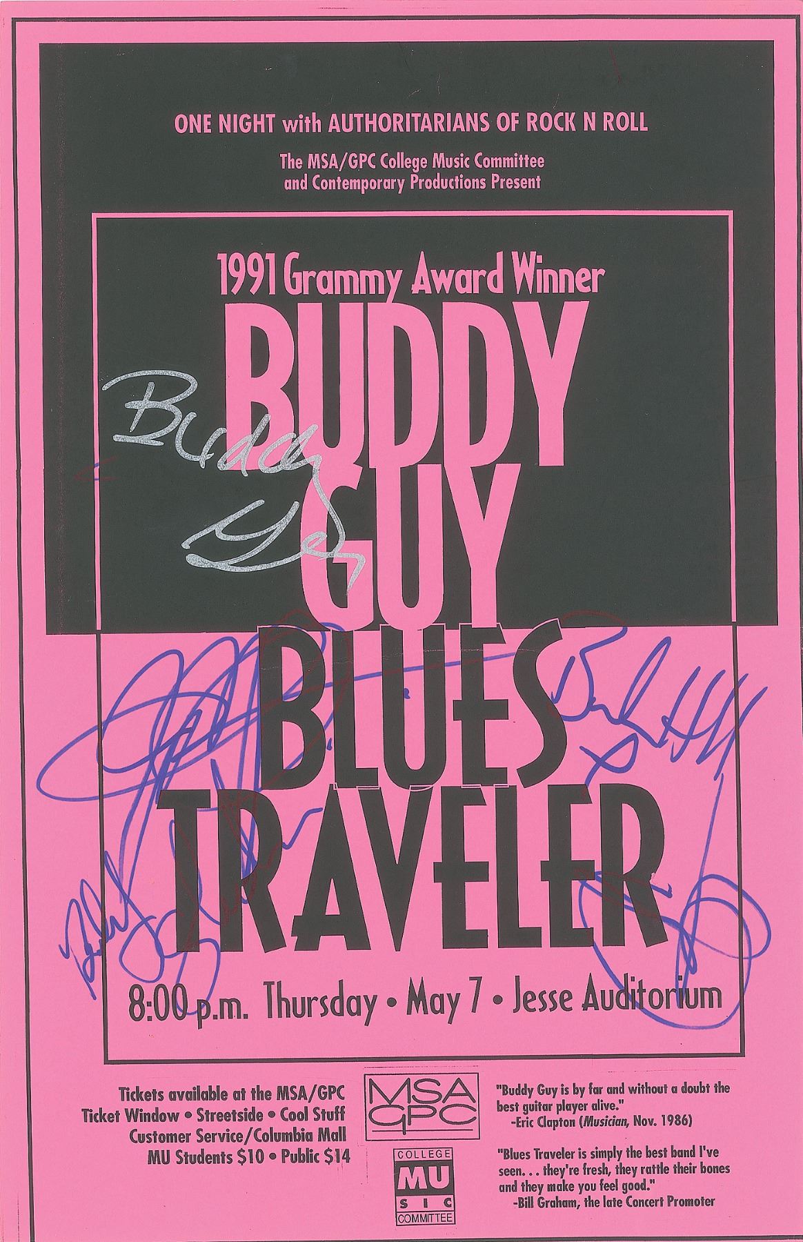 Original black-and-pink 11 x 17 first printing poster for Buddy Guy and Blues Traveler at the Jesse Auditorium on May 7, signed in silver ink by Buddy Guy, and in blue felt tip by John Popper, Bobby Sheehan, Brendan Hill, and Chan Kinchla. In fine condition.