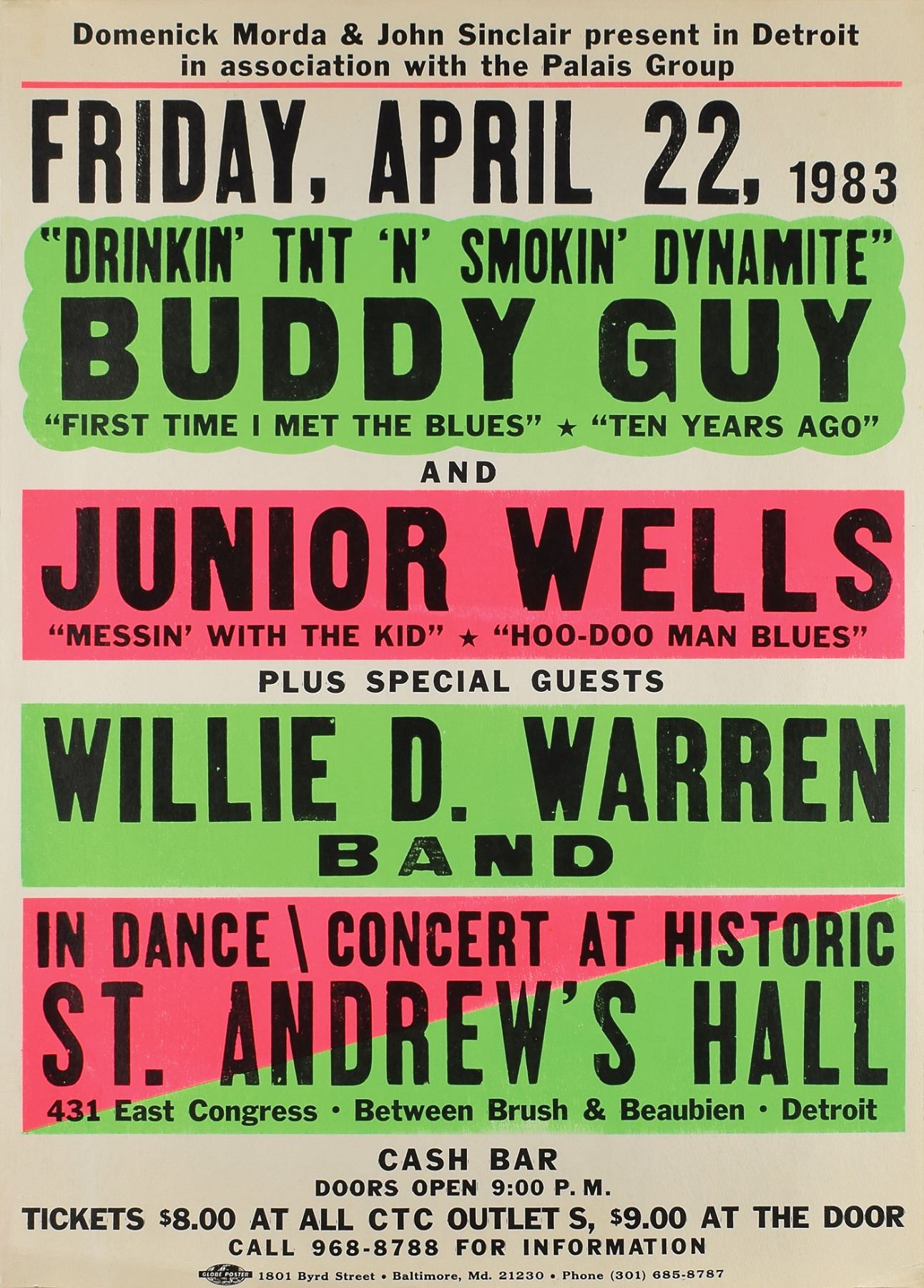 Original color 22 x 30.75 cardboard boxing-style poster advertising a Buddy Guy and Junior Wells concert at St. Andrew's Hall in Detroit, Michigan, on April 22, 1983, with the special guest listed as the Willie D. Warren Band. Printed by Globe Posters in Baltimore. In fine condition.