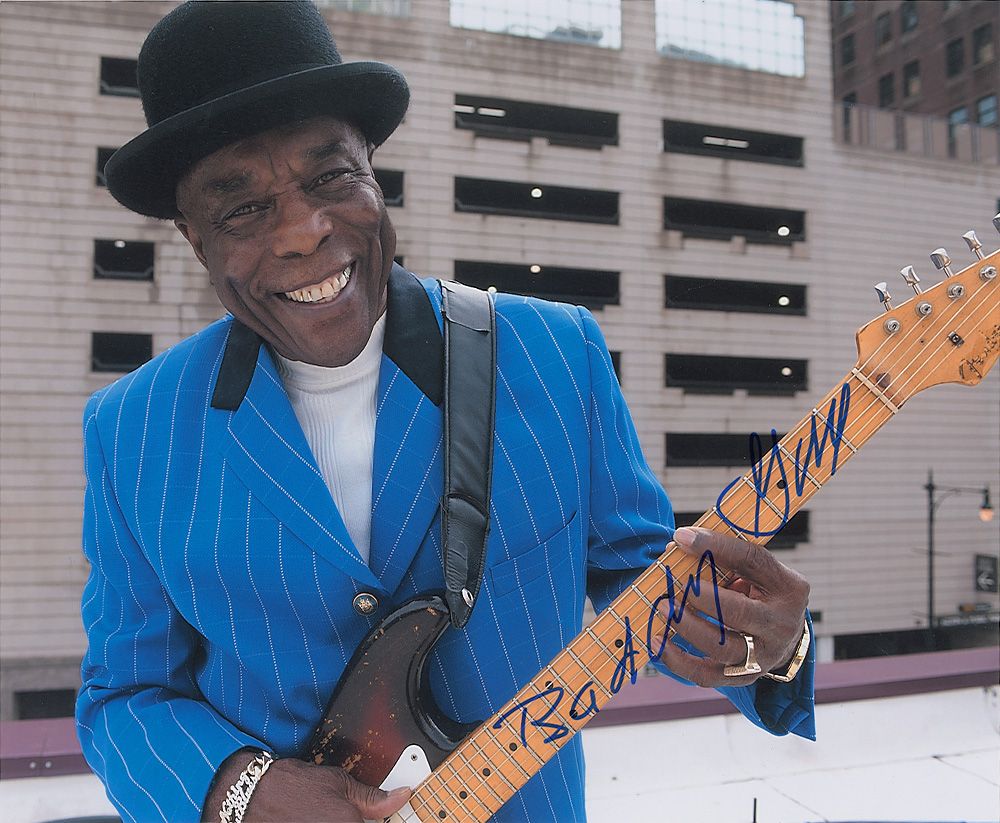 Color satin-finish 14 x 11 photo of Guy posing outdoors with his guitar, signed in blue felt tip. In fine condition.