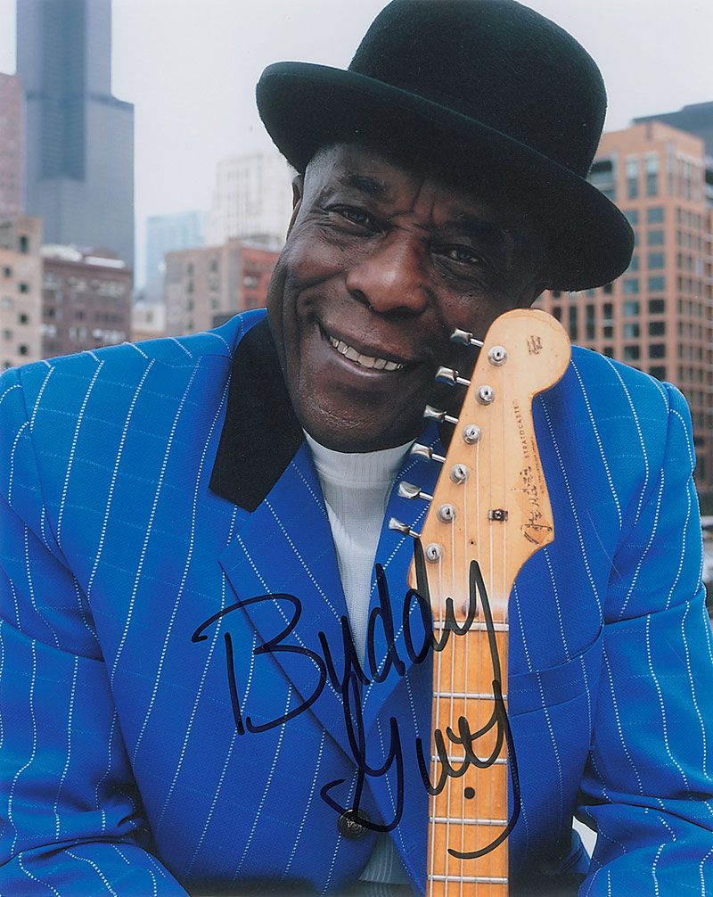 Color satin-finish 8 x 10 photo of Guy posing on a rooftop with his guitar, signed in black felt tip. In very fine condition.