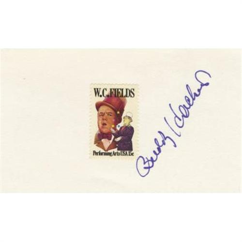 <B>Buddy Hackett Autograph.</B></I> A 5" x 3" card, with a commemorative 15-cent postage stamp affixed, signed by the comedian/actor in blue ink. Hackett's signature spans across the right side of the card and is large and clean. In Excellent condition.<BR><BR><b>Shipping:</b> Flat Material, Small (<a target="_blank" href="http://www.heritageauctions.com/common/shipping.php">view shipping information</a>)