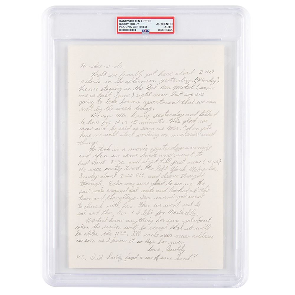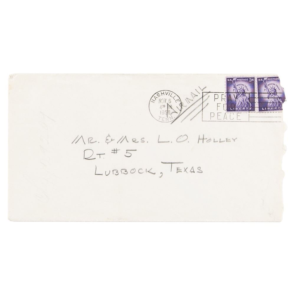 ALS in pencil, signed “Love, Buddy,†one page, 7.25 x 10.5, postmarked in Nashville, Tennessee, on November 6, 1956. Beginning “Hi–chee-o-do,†a handwritten letter to his parents, L.O. and Ella Holley, in full: “Well we finally got here about 2:00 o’clock in the afternoon yesterday. (Monday) We are staying in the Bel Air Motel (same one as last time) right now but we are going to look for an apartment that we can rent by the week today. We saw Mr. Denny yesterday and talked to him for 10 to 15 minutes. He’s glad we came and he said as soon as Mr. Cohen gets here we will start working on material and things. We took in a movie yesterday evening and then we came back and went to bed about 8:30 and slept till just now (12:15). We were pretty tired. We left York, Nebraska, Sunday about 2:00 P.M. and drove straight through. Echo was sure glad to see me. We just rode around Sat. nite and looked at the town and the college. Sun. morning I went to church with her. Then we went out to eat and then Don & I left for Nashville. We don’t know anything for sure yet about when the session will be except that it will be after the 11th. I’ll write our new address as soon as I know it so Bye for now…P.S. Did Daddy find a car of some kind?†In fine condition. Encapsulated in a PSA/DNA authentication holder. Accompanied by the original mailing envelope addressed by Holly.