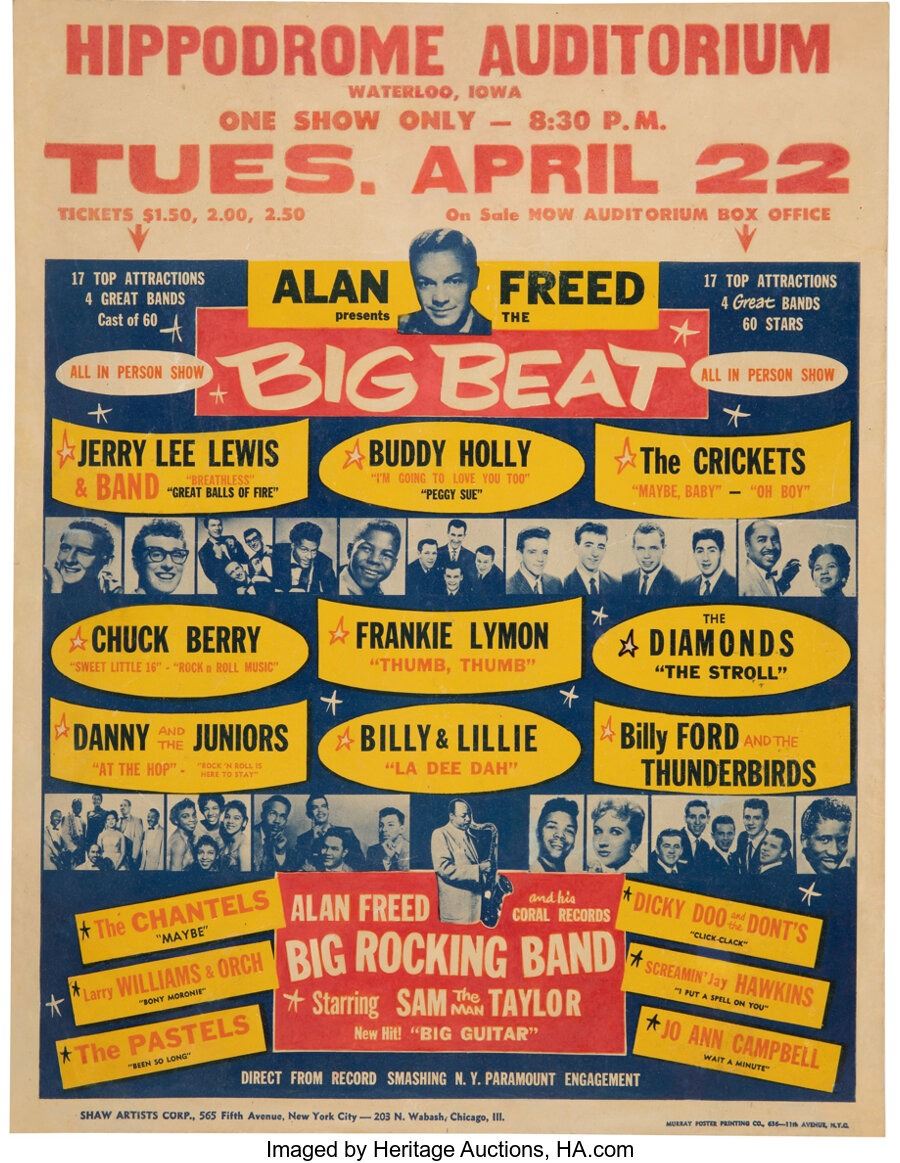 Buddy Holly, Chuck Berry 1958 Alan Freed "Big Beat" Waterloo, IA Concert Poster. Up for auction is this true monster of a rock 'n' roll concert poster, topped by impresario Alan Freed who owned rock 'n' roll at the time, and featuring the musical talents of Buddy Holly The Crickets, Chuck Berry, Jerry Lee Lewis, Frankie Lymon after leaving the Teenagers, Danny The Juniors, The Diamonds, Larry Williams, Screamin' Jay Hawkins and many others.