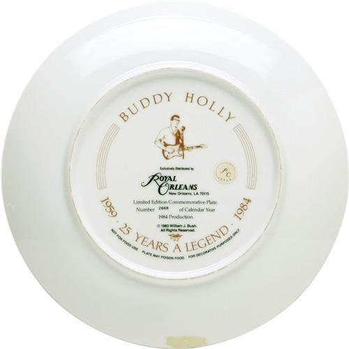 <B>Buddy Holly Commemorative Plate Presented to Maria Elena.</B></I> From a limited edition crafted in 1983 in memorial of the 25th anniversary of Holly's passing, this particular plate was presented to Holly's widow, Maria Elena. The plate features a portrait of Holly standing with a Fender Stratocaster -- a guitar he helped make famous -- in a field outside his home town of Lubbock, Texas. In Excellent condition. <I>With COA from Maria Elena Holly.</B></I>