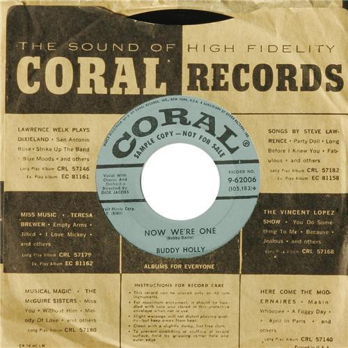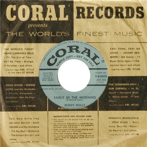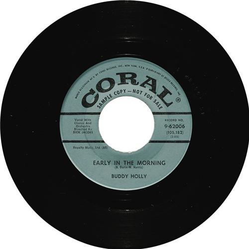 <B>Buddy Holly "Early In The Morning"/ "Now We're One" Blue Label Promo 45 Coral 62006 (1958).</B></I> Buddy's fifth Coral release was a rousing rendition of a song written by Bobby Darin, who also recorded the single in 1958. This one comes from Buddy's own collection. Condition: EX 7.<I>From Maria Elena Holly's personal collection.</B></I>