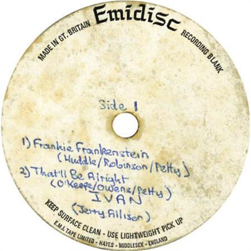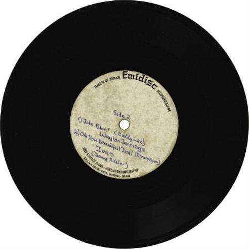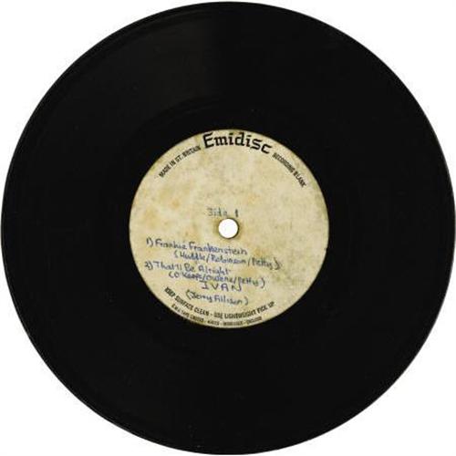 <B>Buddy Holly/Jerry Allison/Waylon Jennings Acetate (UK - Emidisc, c. 1959).</B></I> Here's one we haven't seen before -- a 7" 45 rpm acetate with three songs from Ivan (Jerry Allison): "Oh You Beautiful Doll" (with Buddy Holly on guitar), "Frankie Frankenstein", and "That'll Be Alright"; plus Waylon's version of the Cajun classic "Jole Blon". Condition: EX 7.<BR><BR><b>Shipping:</b> Recordings (<a target="_blank" href="http://www.heritageauctions.com/common/shipping.php">view shipping information</a>)