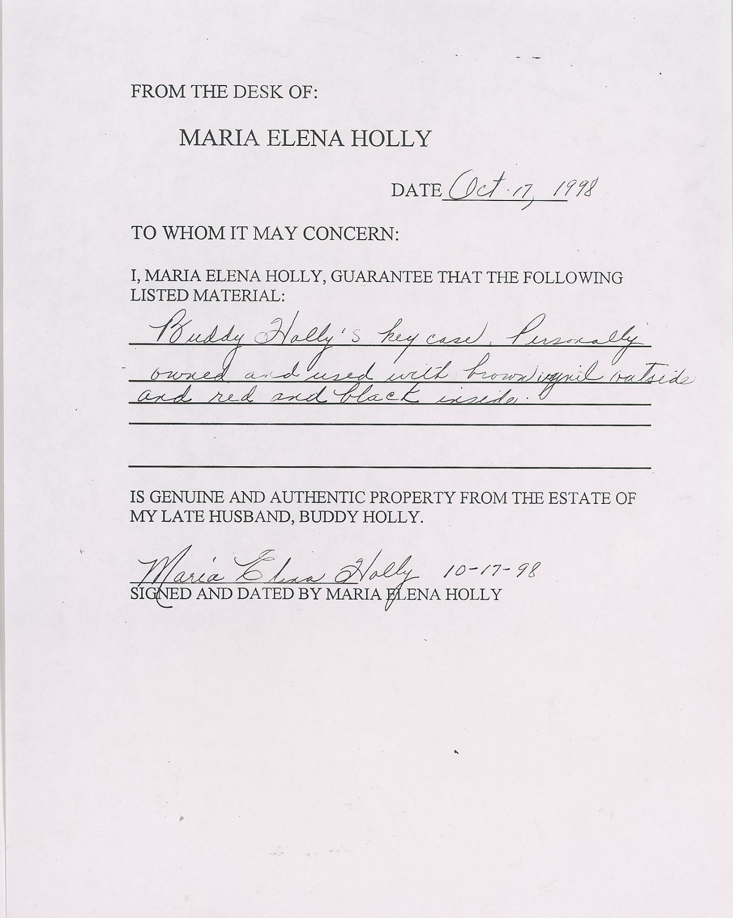 Buddy Holly's personally-owned and -used brown vinyl key case with snap-button flap, red pattern interior lining, set of six key loops, three keys, and one key-ring. In fine condition. Accompanied by a letter of provenance from his wife, Maria Elena Holly, certifying that the key case "is genuine and authentic property from the estate of my late husband, Buddy Holly."