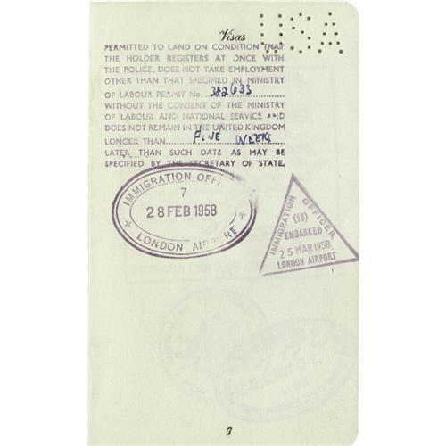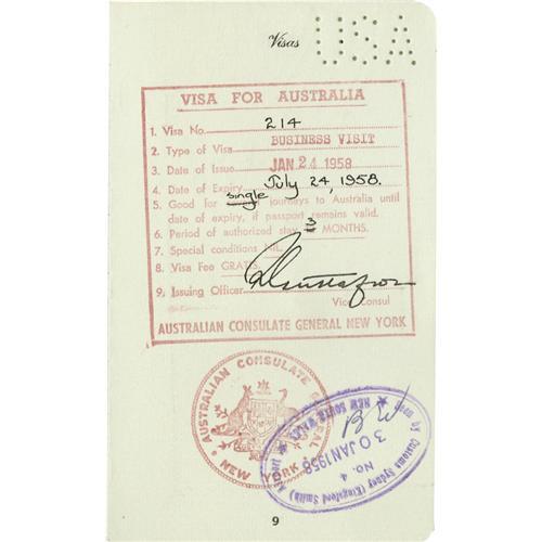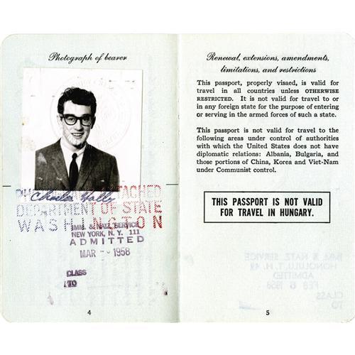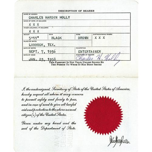 <B>Buddy Holly Passport.</B></I> Issued to Charles Hardin Holly on January 23, 1958, it features a picture of Buddy and is signed twice with his real name, Charles Holley. The passport was obtained by Holly not long before he and the Crickets embarked on their legendary tour of the U. K., and is stamped with visits to England dated February 28 and March 25, 1958, as well as Australia dated January 30 and July 24, 1958. In a true sign of the times, the restrictions page states that the document was not valid for travel in "Albania, Bulgaria, and those portions of China, Korea and Viet-Nam under Communist control." This one-of-a-kind item chronicles the U. K. tour that made the future founders of such British groups as the Beatles and the Rolling Stones aware of Holly's genius, and is in Excellent condition with only the faintest signs of wear. <I>With COA from Maria Elena Holly.</B></I>