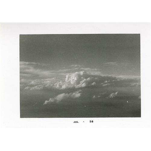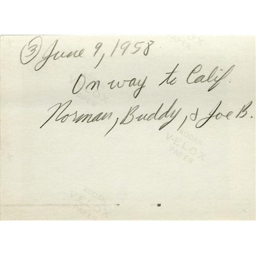 <B>Buddy Holly Photo.</B></I> This 5" x 3.5" b&w cloudscape photo was snapped by Holly from the plane while he and producer-manager Norman Petty and bassist Joe B. Mauldin were on a flight to California. The notation "June 9, 1958/On way to Calif. Norman, Buddy, + Joe B." is inscribed on the back in pencil by Holly. The musician would have a falling out with Petty (with whom the Crickets had done most of their recording) over finances and other issues, and split with both Petty and his backing band a few months after this photo was taken. An intriguing and haunting photo, the print is in Excellent condition. <I>With COA from Maria Elena Holly.</B></I>