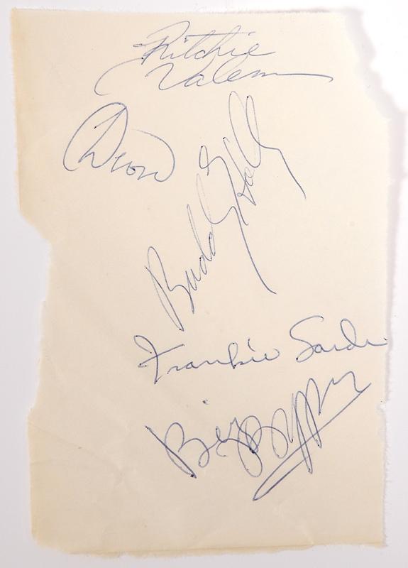 Buddy Holly, Ritchie Valens, Big Bopper - Autographs From the Winter Dance Party. Signatures of Buddy Holly, the Big Bopper, Ritchie Valens, Dion (of Dion and the Belmonts), and Frankie Sardo, on a 6x4" page torn from an autograph album, all obtained some time between January 23 and February, 1959, during the last tour of Buddy Holly, the Big Bopper (J.P. Richardson), and Richie Valens. The Winter Dance Party tour started in Chicago on January 23, 1959. Along with the three big stars were Dion and the Belmonts and Frankie Sardo; Sardo was not well known. After eleven dates throughout the Midwest, early in the morning of February 3, 1959, the three stars were killed in a plane crash just north of Clear Lake, Iowa, where they had played at the Surf Ballroom. The pilot of the light plane, Roger Peterson, was also killed. Don McLean wrote the song "American Pie" commemorating the lost of the stars "the day the music died."