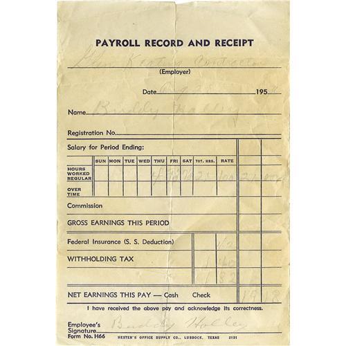 <B>Buddy Holly Signed Payroll Receipt.</B></I> Dated August 28, 1956, this payroll receipt for $19.18 (after deductions) from a contractor is signed by Holly at the bottom in pencil. In very nice condition with mild tanning and some light fading of the handwriting. <I>With COA from Maria Elena Holly.</B></I>