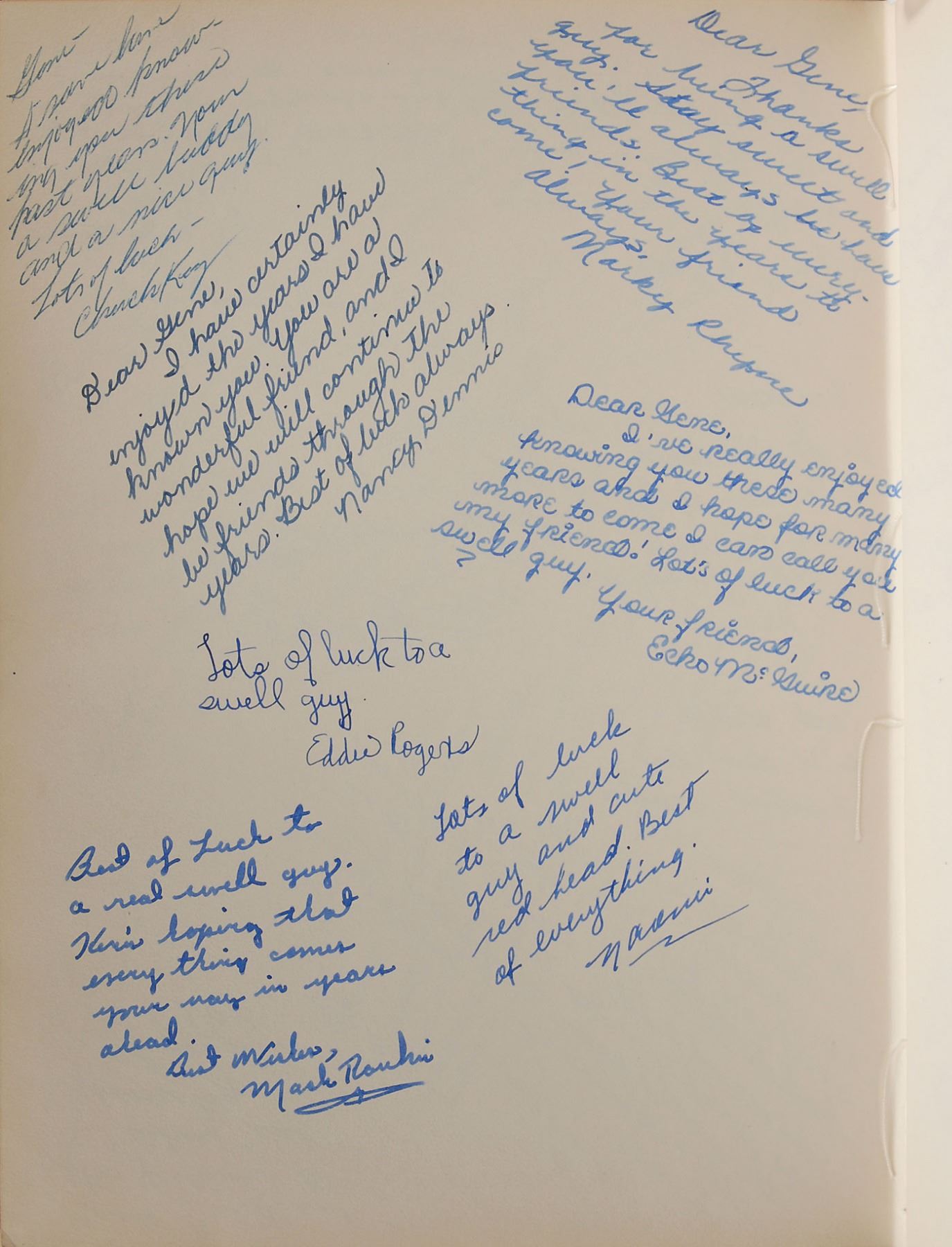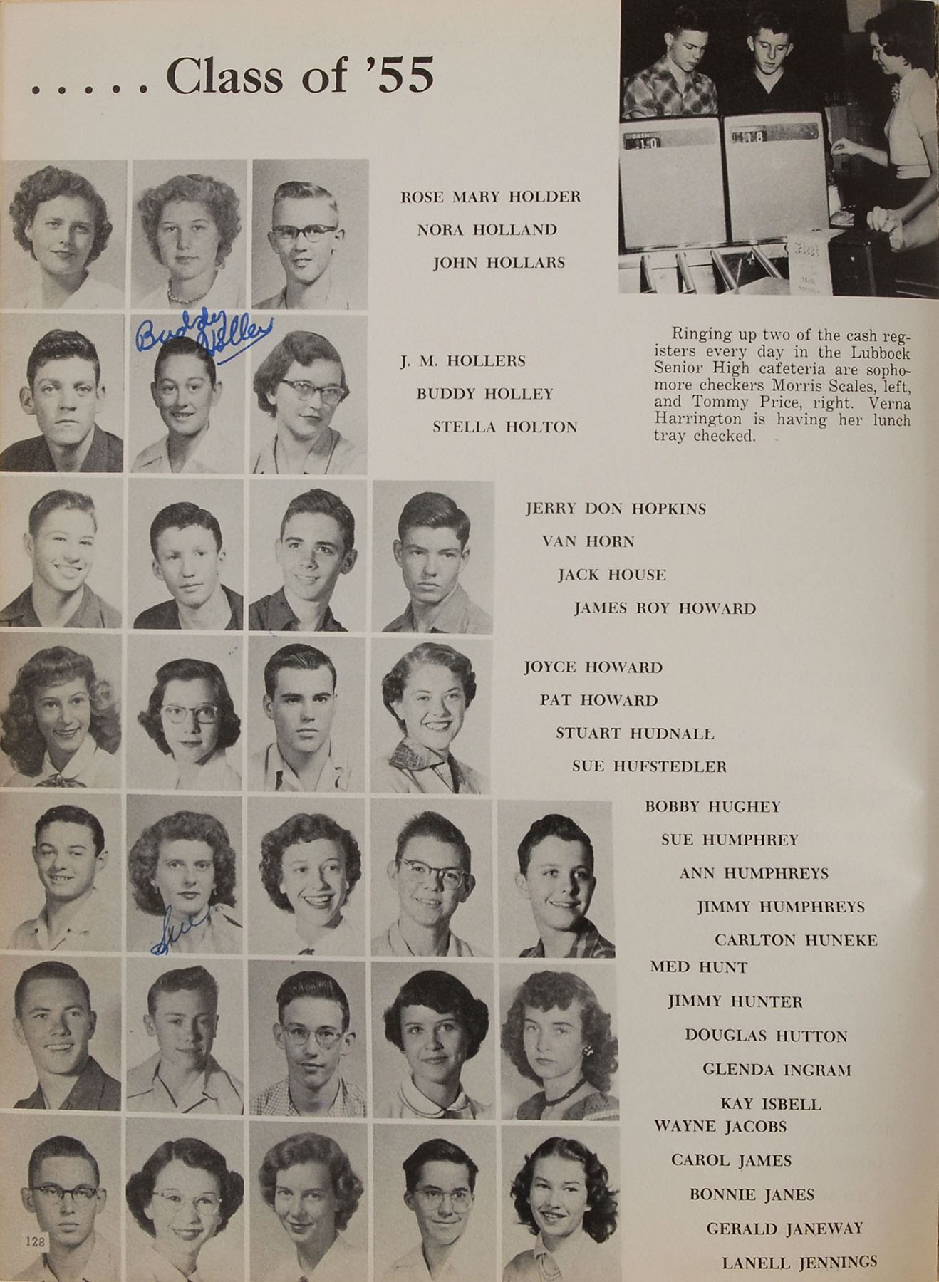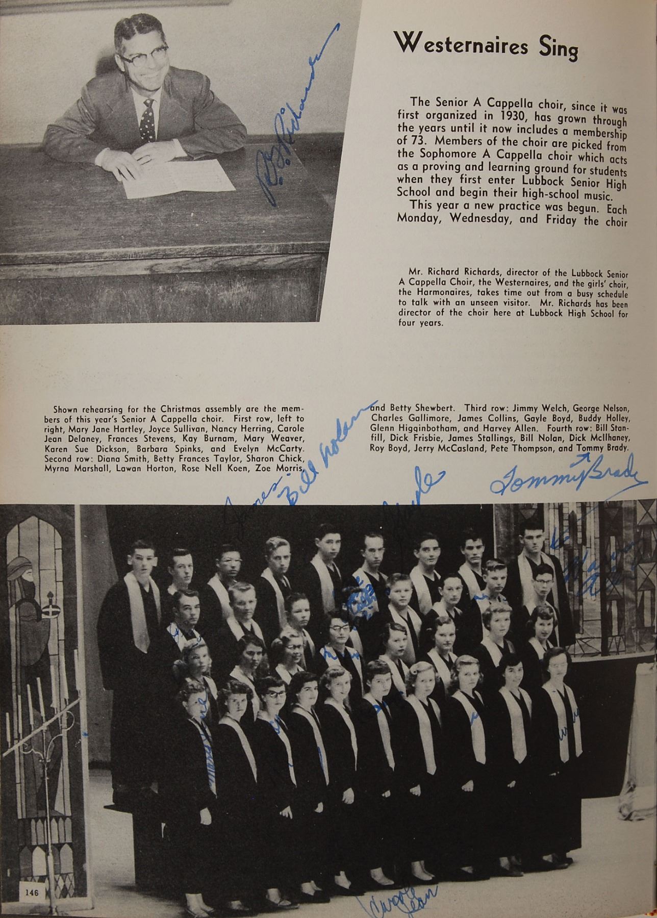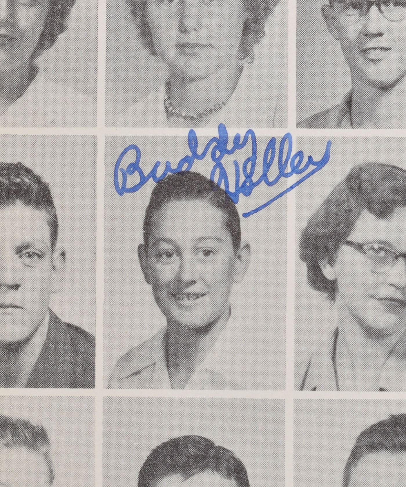 Original 1953 Lubbock High School 'The Westerner' yearbook, 7.75 x 10.75, 320 pages, signed in blue ink, "Buddy Holley," as a member of the sophomore class above his student photo on page 128. Also inscribed by Holly on a free end page at the back of the book, "—Gene—To a great pal. Here's hopin' you'll have the best of luck in the years to come." Includes a Westerner yearbook from 1954 (not signed by Holly), depicting Holly as a member of the junior class on page 94, and on page 146 as a member of the Senior A Capella choir. Both yearbooks are signed by Holly's longtime girlfriend Echo McGuire. In overall very good to fine condition. The consignor notes that "Gene" was one of Holly's classmates, and they actually recorded a song together. Born in Lubbock as Charles Hardin Holley, but known to all as 'Buddy,' Holly dropped the 'e' from his surname after Decca misspelled it in his original 1956 recording contract. A superb early autograph from the pioneering rock 'n' roller.