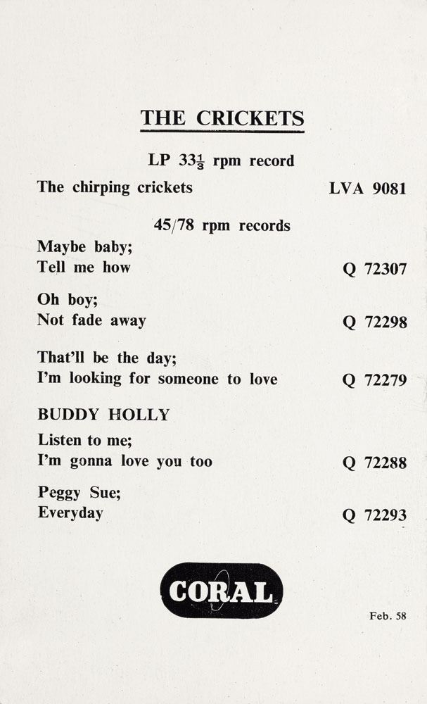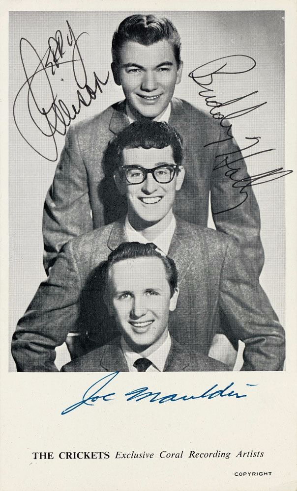 Scarce vintage circa 1958 Coral Records promo card featuring "The Crickets," 3.5 x 5.75, signed in black ballpoint by Buddy Holly and Jerry Allison, and in blue ballpoint by Joe Mauldin. The reverse lists the group's lone LP (The Chirping Crickets) and their singles, including the classics 'Not Fade Away,' 'That'll Be the Day,' and 'Peggy Sue.' In fine condition. An exceptionally well preserved, boldly signed example.