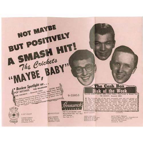 <B>Buddy Holly and the Crickets Original Flyer.</B></I> "Not Maybe But Positively a Smash Hit!" declares this 8.5" x 11" vintage pink flyer promoting the Buddy Holly and the Crickets single "Maybe, Baby." In near pristine condition with two vertical fold creases and some very small instances of discoloration. <I>With COA from Maria Elena Holly.</B></I>