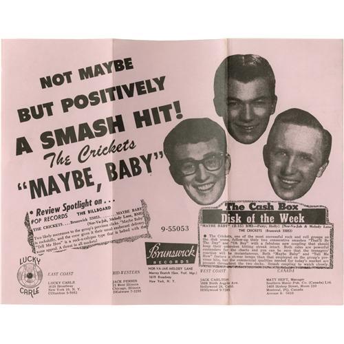 <B>Buddy Holly and the Crickets Original Flyer.</B></I> "Not Maybe But Positively a Smash Hit!" declares this 8.5" x 11" vintage pink flyer promoting the Buddy Holly and the Crickets single "Maybe, Baby." In near pristine condition with two vertical fold creases and some very small instances of discoloration. <I>With COA from Maria Elena Holly.</B></I>