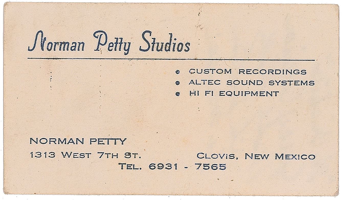 Extremely rare purple ink signatures of Buddy Holly, Niki Sullivan, Joe Mauldin, and Jerry Allison, who adds "'The Crickets,'" on the reverse of a 3.5 x 2 business card from Norman Petty Studios in Clovis, New Mexico. In fine condition, with light soiling and a few small edge creases.