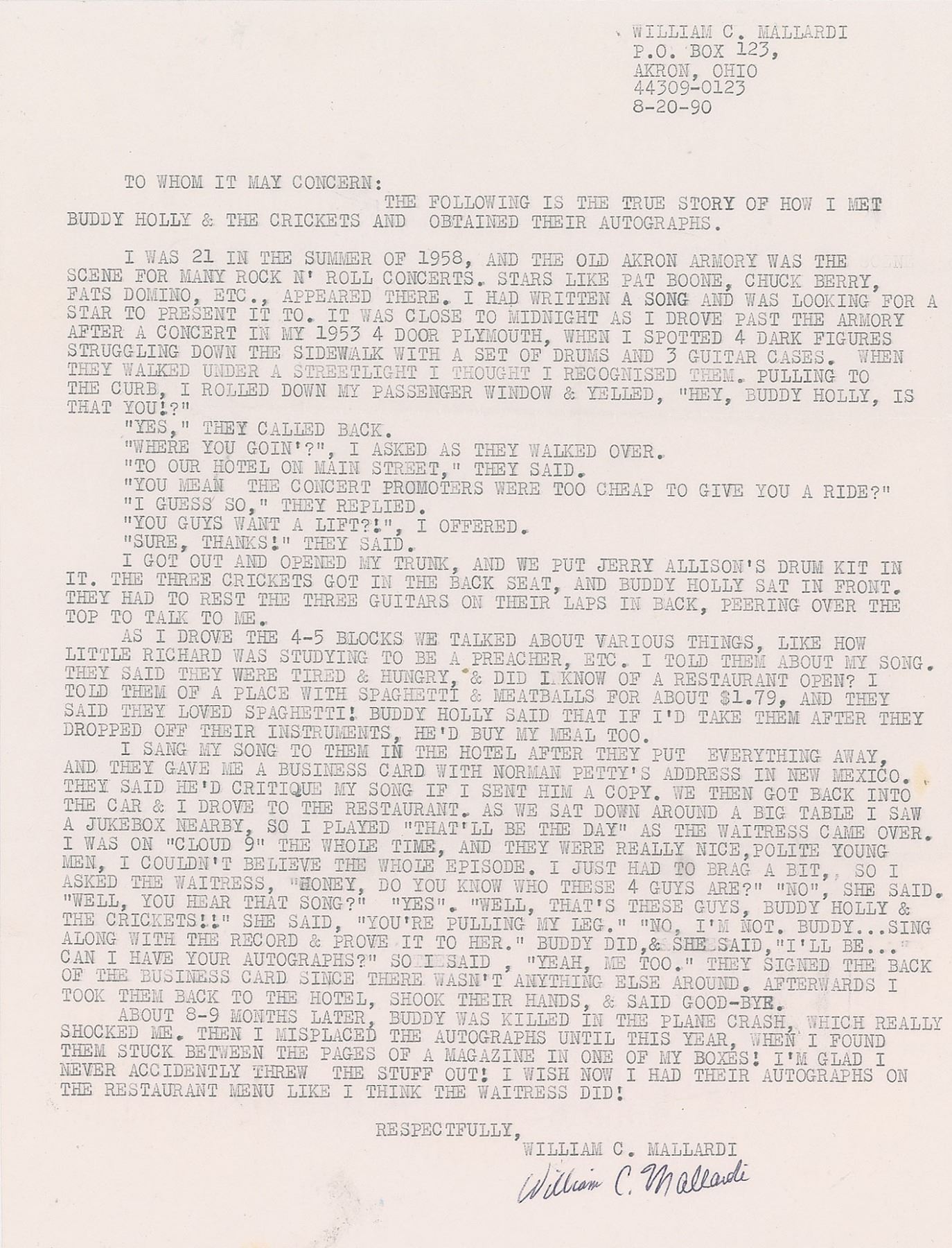 Accompanied by a detailed letter of provenance from the original recipient, in part: "I was 21 in the summer of 1958, and the old Akron Armory was the scene for many rock n' roll concerts. Stars like Pat Boone, Chuck Berry, Fats Domino, etc., appeared there, I had written a song and was looking for a star to present it to. It was close to midnight as I drove past the Armory after a concert…when I spotted 4 dark figures struggling down the sidewalk with a set of drums and 3 guitar cases. When they walked under a streetlight I thought I recognized them. Pulling to the curb, I rolled down my passenger window & yelled, 'Hey, Buddy Holly, is that you!?' 'Yes,' they called back…'You guys want a lift?!' I offered…I got out and opened my trunk, and we put Jerry Allison's drum kit in it. The three Crickets got in the back seat, and Buddy Holly sat in front. They had to rest the three guitars on their laps in back…