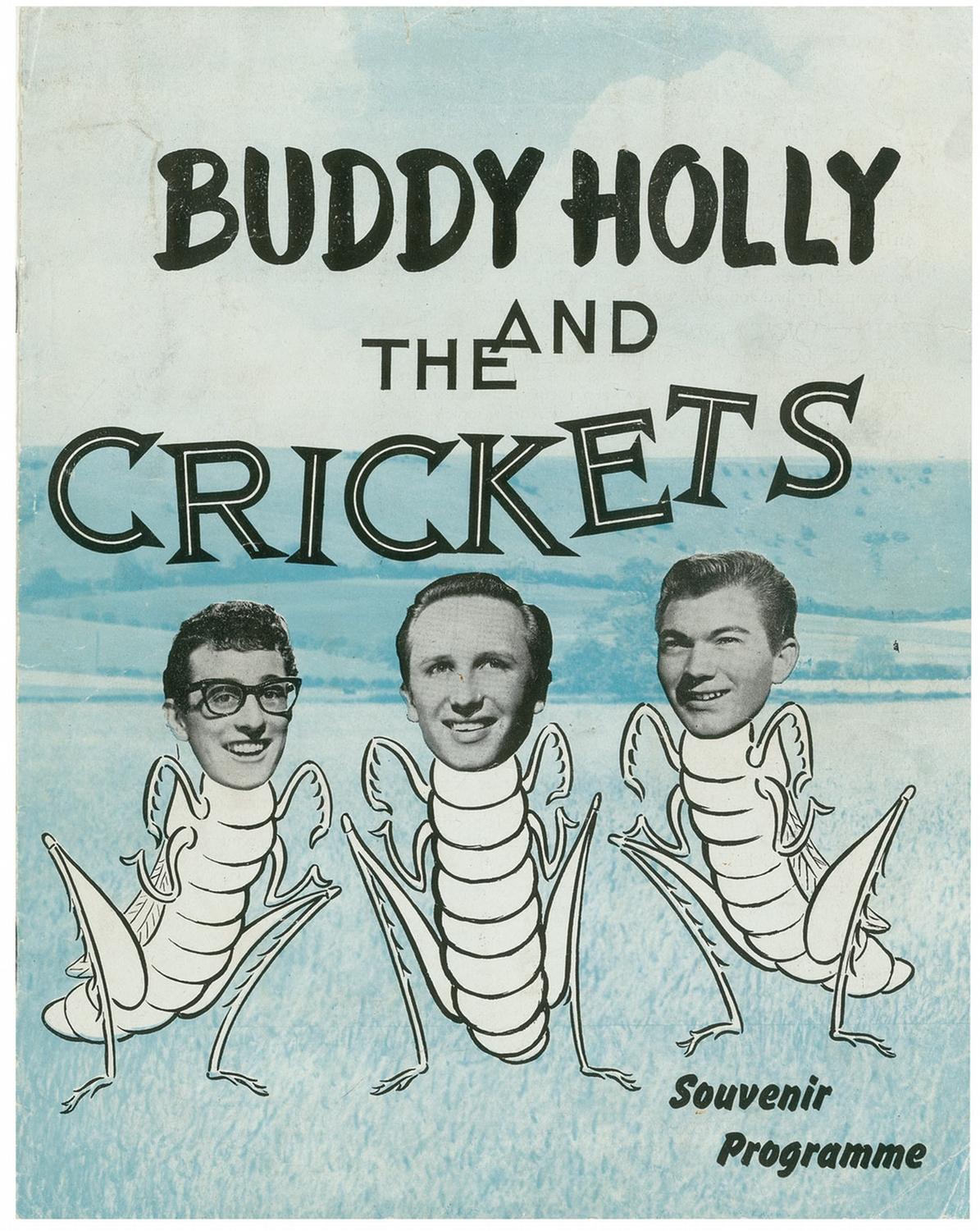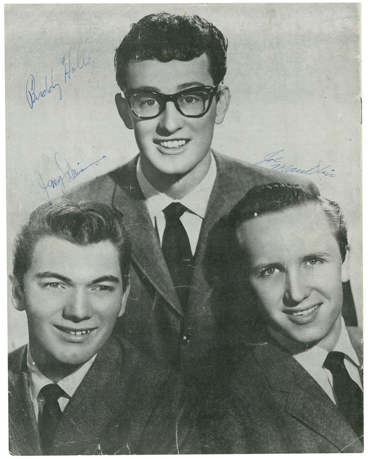 Original vintage 1958 Buddy Holly and the Crickets souvenir program, 8.5 x 10.5, signed on the back cover full-page photo in fountain pen by Buddy Holly, Jerry Allison, and Joe Mauldin. Creasing and wrinkling with a faint diagonal crease running through the upper portion of Holly’s name, mild to moderate wear, a few small tears, and a split from the head of the spine to the bottom staple, otherwise very good condition. The faults do not detract from this always desirable set of signatures. Holly’s popularity was huge in England, rivaling that of fellow singer Elvis Presley. However, unlike Elvis, Holly and the Crickets spent a memorable month touring the country, which is still written about today. In the process, Holly and his band went on to inspire the likes of the Rolling Stones, and John Lennon and Paul McCartney of the Beatles.